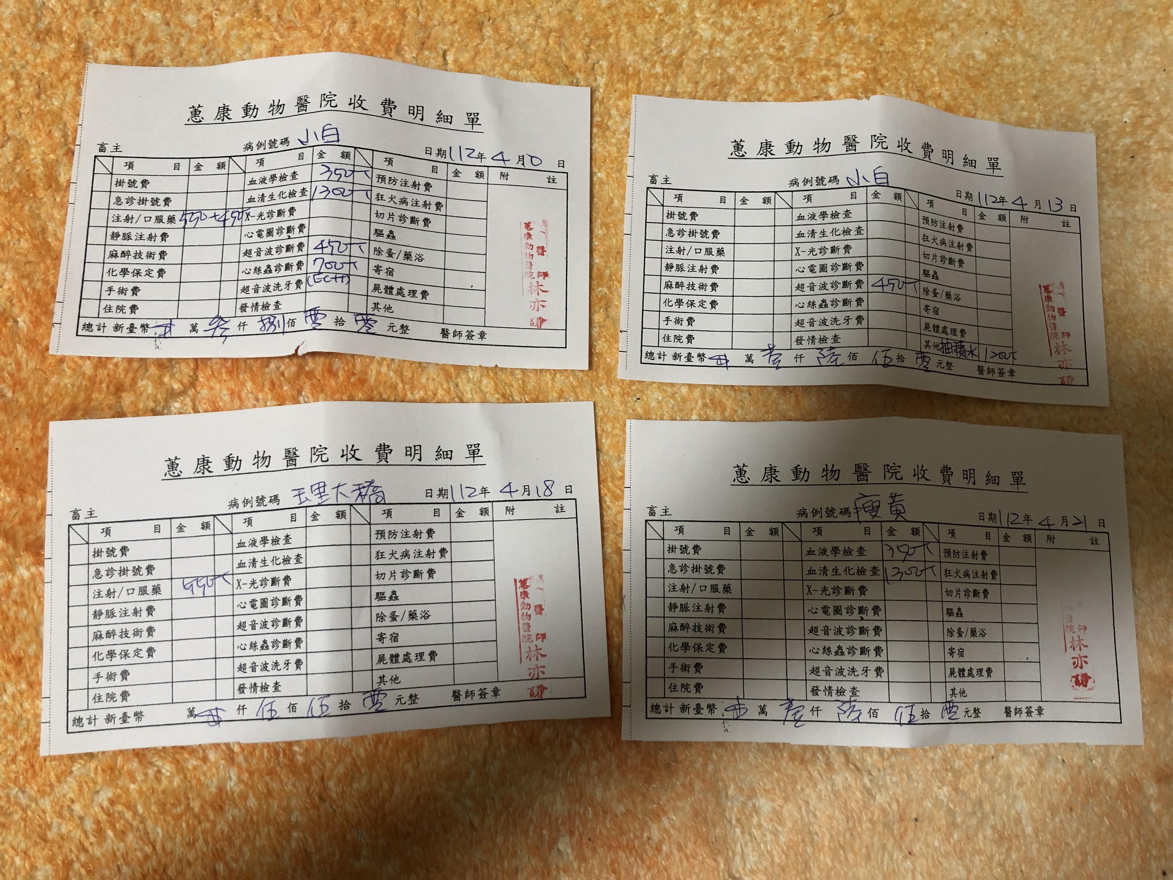 上月累計:44040 本期支付積欠之醫療費用明細: 蕙康動物醫院111/12-112/4月醫療費用共計$18950 中華動物醫院111年度欠費共計$8700 總支付費用$27650 餘:$16390 |