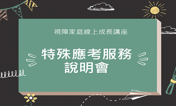 本年度第二場視障家庭線上成長講座,邀請到「臺北市立啟明學校」黃壬怡老師及柳超莊老師擔任講師,分享有關特殊應考服務說明會的認識!