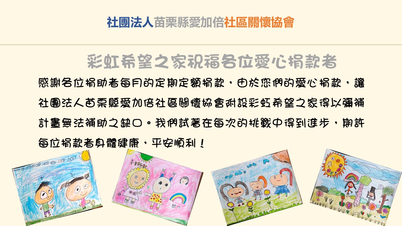 謝謝各位持續捐款支持「社團法人苗栗縣愛加倍社區關懷協會」,與您分享上個月的協會大小事與款項使用狀況。