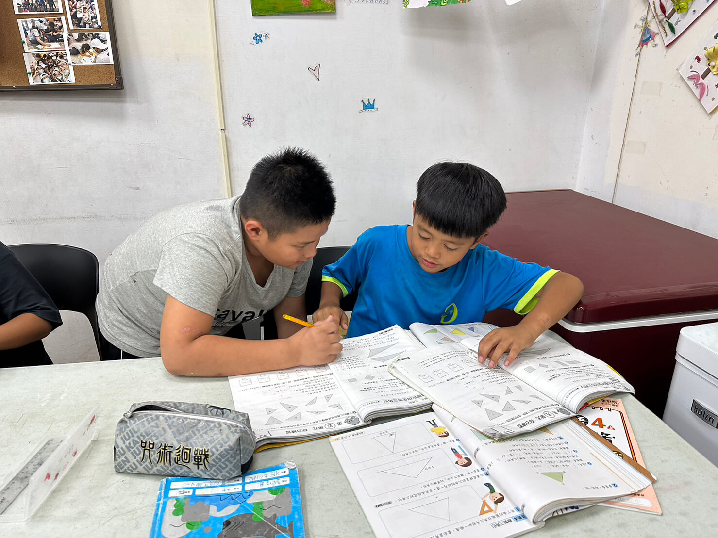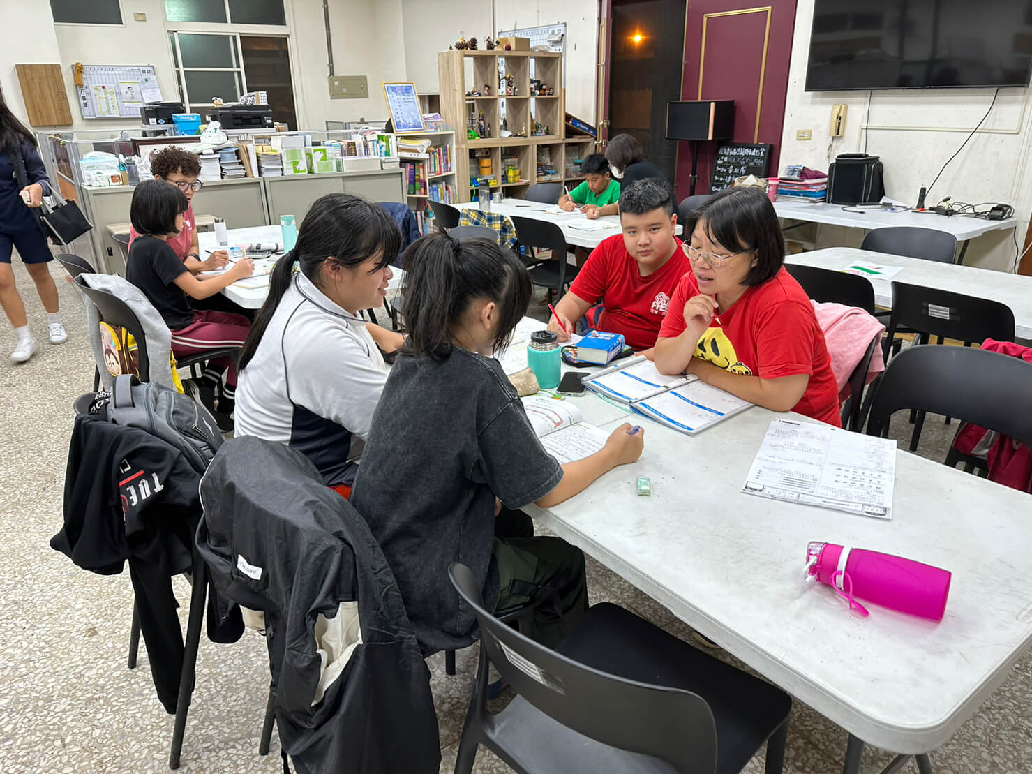 老師與孩子分成各個小組,幫助孩子完成作業。
