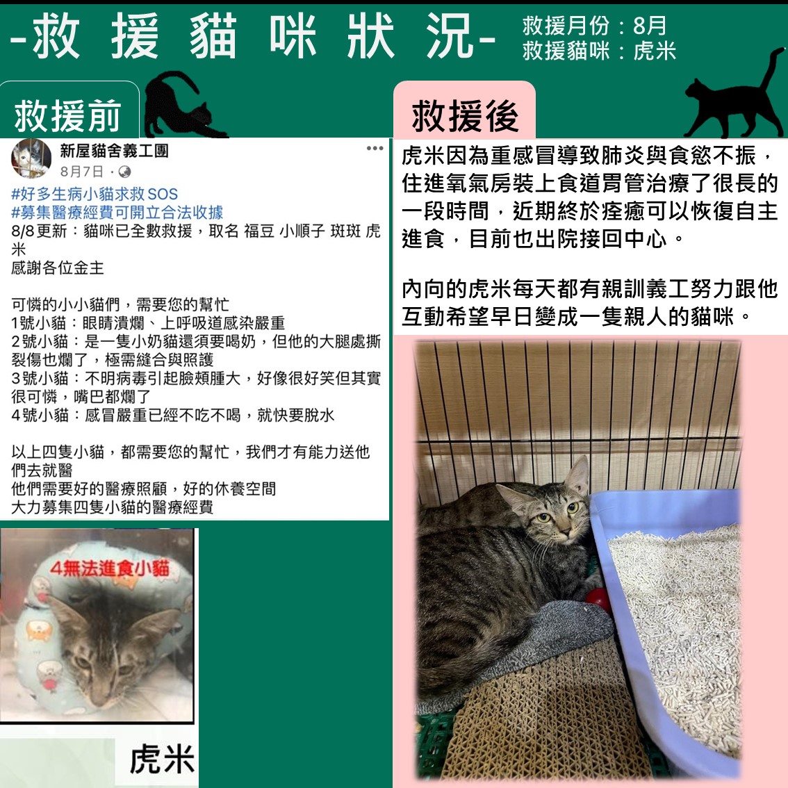 | 上個月募得金額使用項目 | 1、醫療及藥品費:39,090元。2、辦公室設備:12,768元。3、火化費:1,800元。 |
