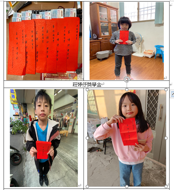 開學了,協會持別感謝善心人士江品睿先生捐贈本會「莊婷伃獎助學金」、張高島先生捐贈本會「磚好磚好孝親獎學金」每名小朋友2000元獎學金、江原慕先生捐贈「文財神祖廟獎學金」每名小朋友1000元的獎學金,讓父母不用擔心開學的學費,社工員也放下心中的擔憂,小朋友可以順利上學上課,所以感謝大家的善心和愛心,有您們真好。