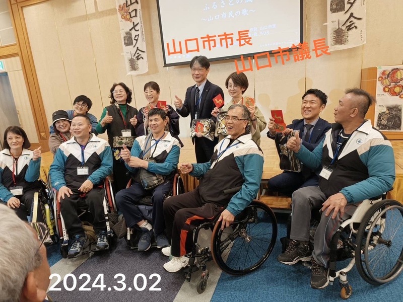 高雄→桃園機場→日本羽田機場→日本山口縣機場,轉機、路程 搖遠的奔波加上5部隨身輪椅、5台運動輪椅、行李等的 搬運,是辛苦些,但是主辦單位的餐、宿、交通等的全力支持與盛情招待及接受 山口市 市長 伊藤和貴 邀約,參與了山 口市一年一度 七夕會的喜宴,劉 總幹事、美玲 翻譯、歐 志工、隊員們都被受禮遇、敬酒、合照,給大夥們帶來不同文 化的體驗與滿滿台日友誼溫馨的回憶- - - -