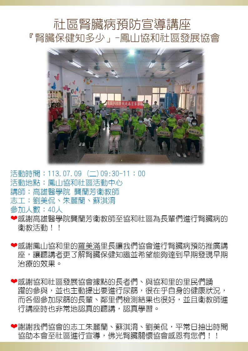 (1)113.07.09(二)09:30-11:00社區腎臟病預防宣導講座『腎臟保健知多少」-鳳山協和社區發展協會。