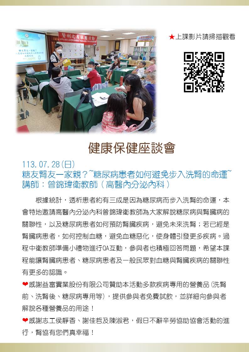 (1)113.07.28(日)09:30-11:30糖友腎友一家親?~糖尿病患者如何避免步入洗腎的命運~。