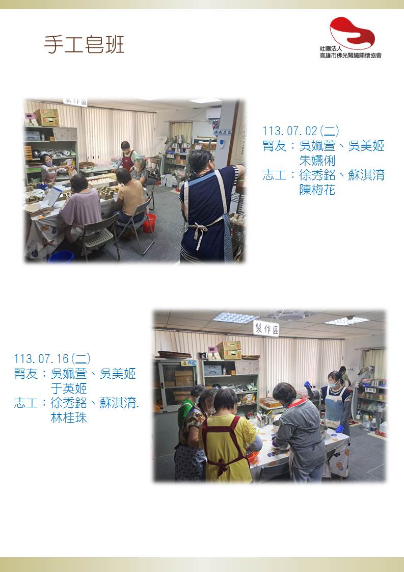 根據統計,透析患者約有三成是因為糖尿病而步入洗腎的命運,本會特地邀請高醫內分泌內科曾錦瑋衛教師為大家解說糖尿病與腎臟病的關聯性,以及糖尿病患者如何預防腎臟疾病,避免未來洗腎;若已經是腎臟病患者,如何控制血糖,避免血糖惡化,使身體引發更多疾病。過程中衛教師準備小禮物進行QA互動,參與者也積極回答問題,希望本課程能讓腎臟病患者、糖尿病患者及一般民眾對血糖與腎臟疾病的關聯性有更多的認識。5.手工皂班:共2次。