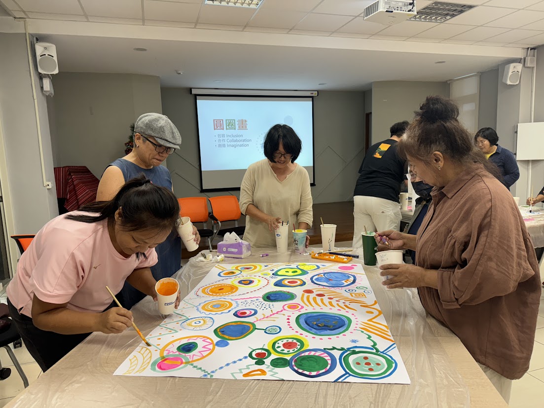 另一個活動是「圓圈畫」,每個人手中一支水彩筆,選擇一個自己喜歡的顏色,然後在海報紙上從圓圈開始作畫,大圈、小圈、塗滿顏色的圈、線條…,大家在畫中找到自己的位置,用各種色彩一起豐富這個創作,過程中可以體會如何彼此包容、合作及互相欣賞彼此揮灑的創造。