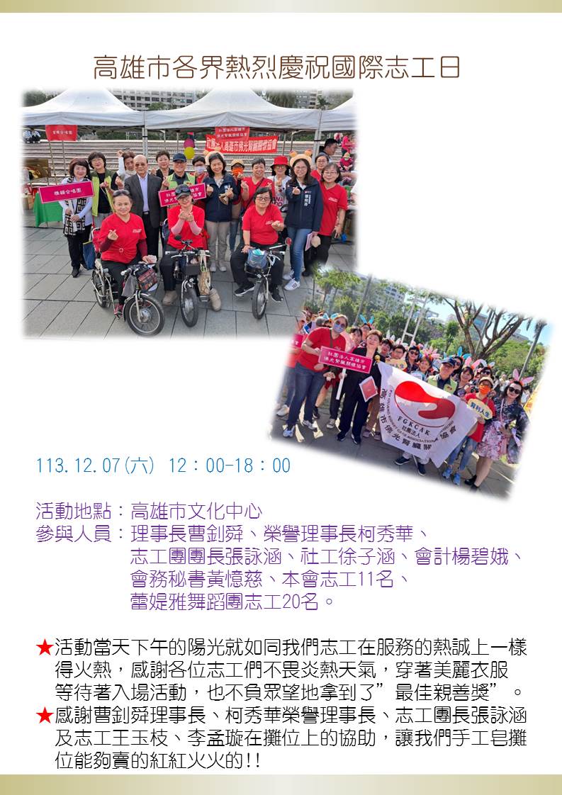 (1)113.12.07(六)12:00-18:00高雄市各界熱烈慶祝國際志工日。