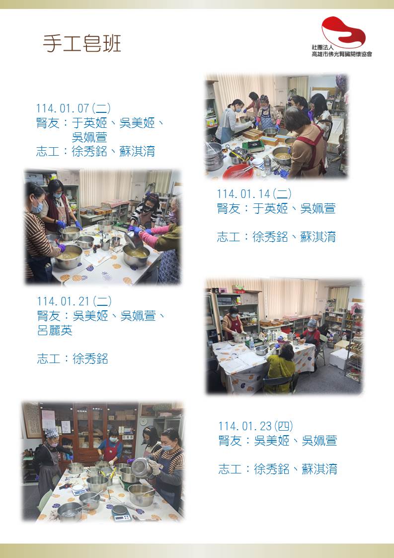 3.手工皂班:共4次,114年01月07日、114年01月14日、114年01月21日、114年01月23日。