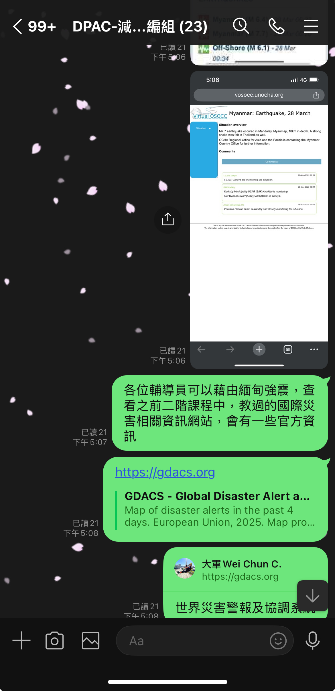 3月28日 透過緬甸地震,本會成立追蹤小組,實時提供國際救援組織的各項訊息,也讓大家交流、複習過往訓練課程的內容。