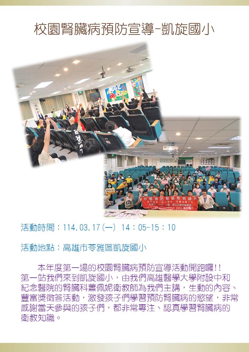(1)114.03.17(一)14:00-15:00校園腎臟病預防宣導講座『腎臟保健知多少」-高雄市苓雅區凱旋國小。