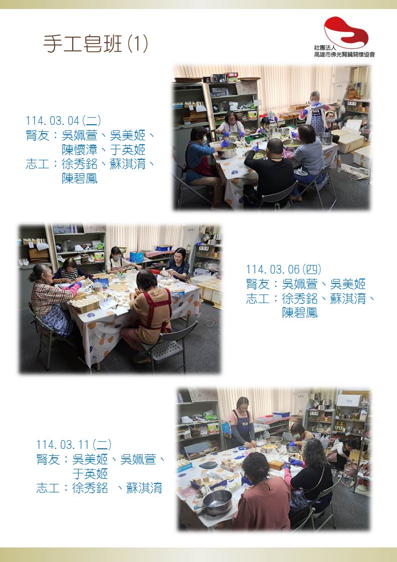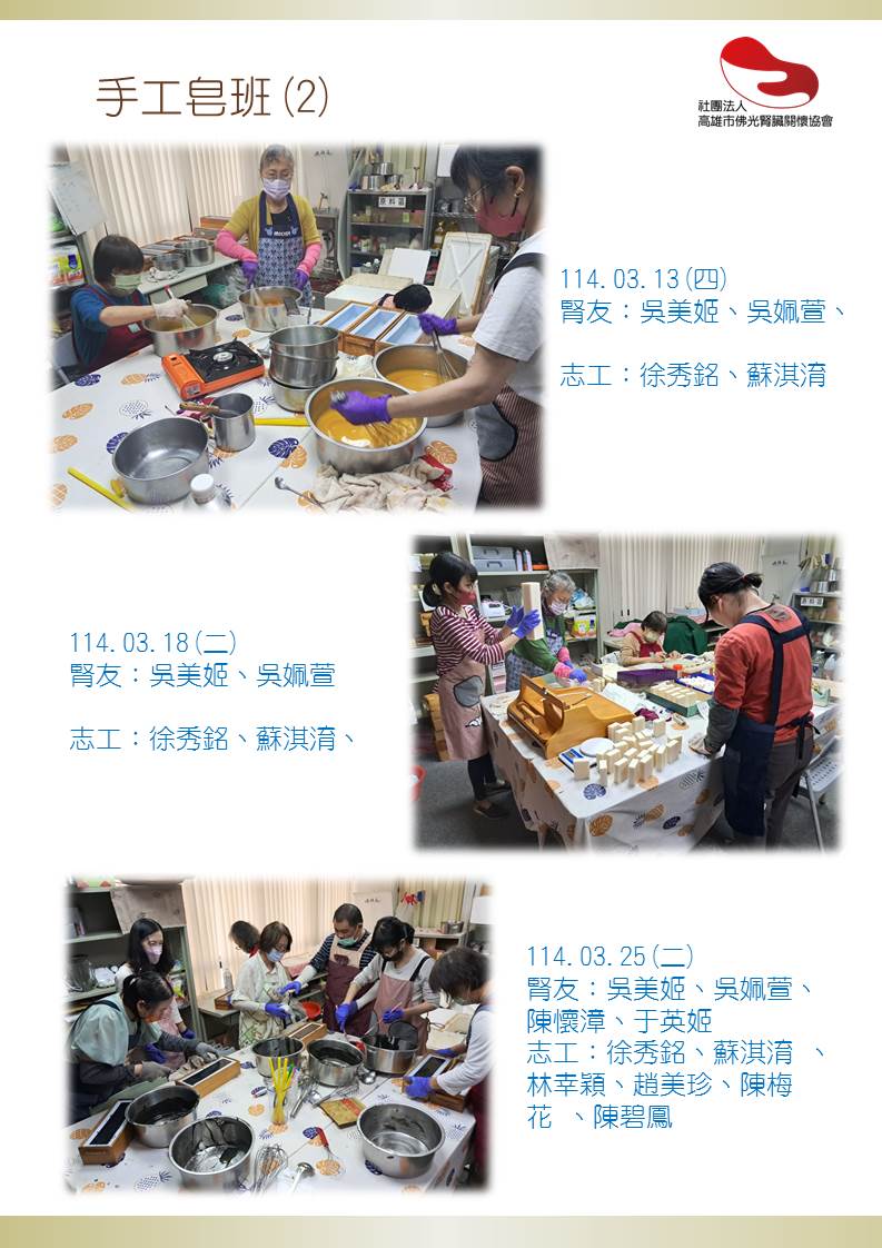 5.手工皂班:共6次,114年03月04日、114年03月06日、114年03月11日、114年03月13日、114年03月18日、114年03月25日。