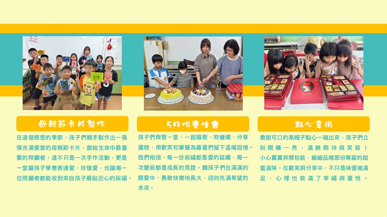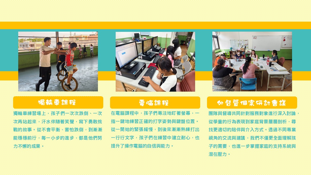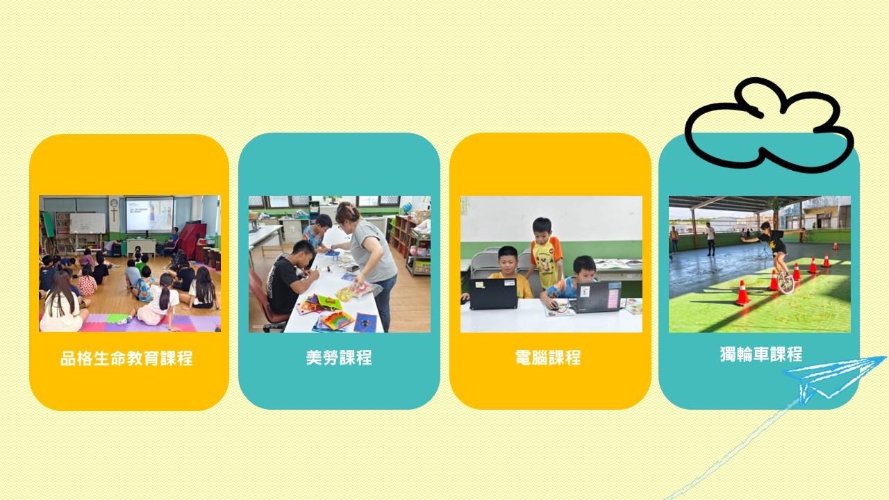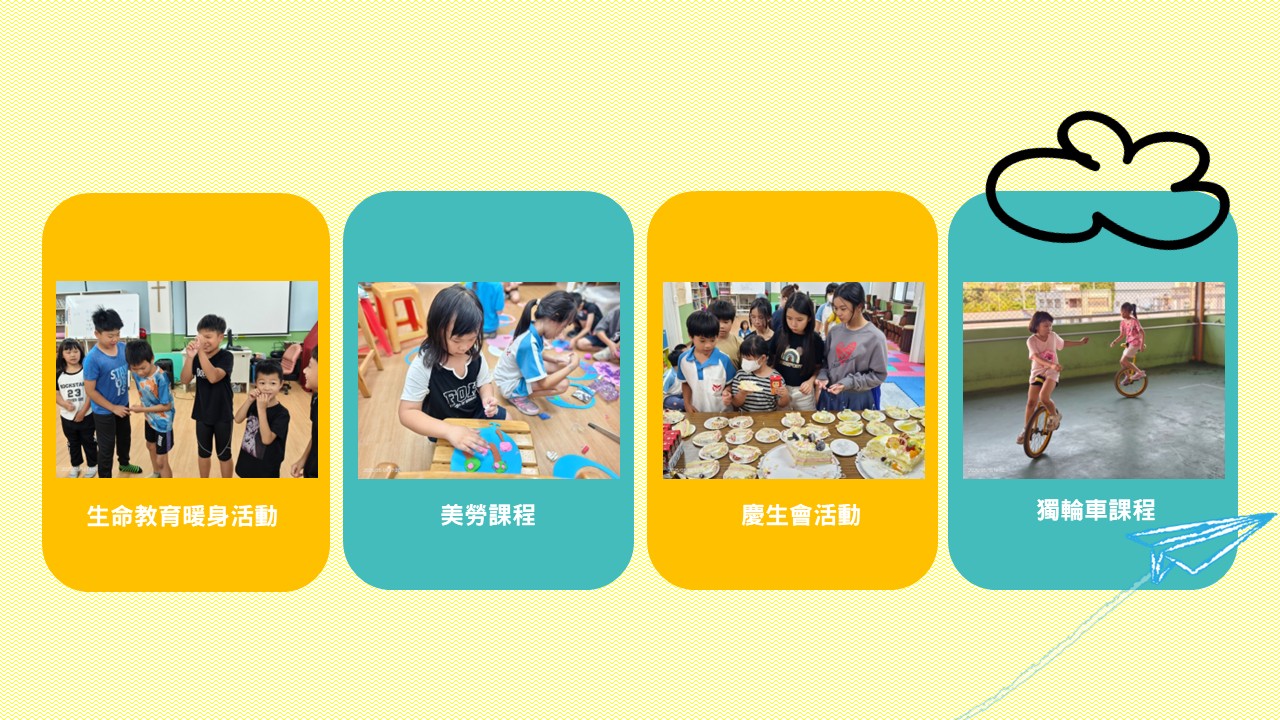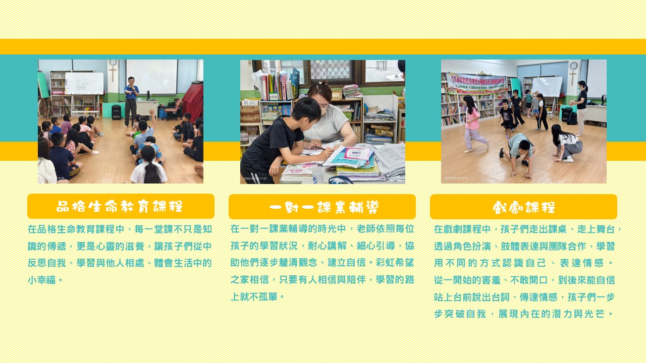 目前彩虹希望之家服務31位來自單親、新住民、隔代教養及經濟弱勢家庭的國小學童,內容涵蓋課後作業輔導、品格生命教育、舞蹈、戲劇、獨輪車等才藝課程、美勞創作與文化生態體驗活動,並安排午間休憩與交通接送,全方位減輕家庭壓力,陪伴孩子穩定向前。