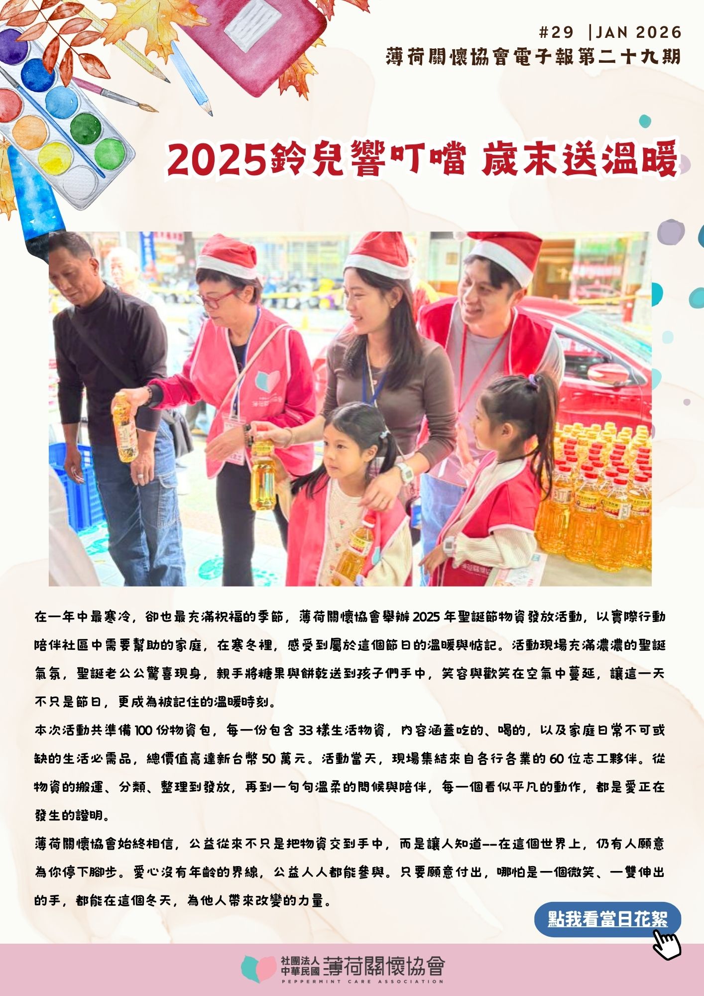 在一年中最寒冷,卻也最充滿祝福的季節,薄荷關懷協會舉辦 2025 年聖誕節物資發放活動,以實際行動陪伴社區中需要幫助的家庭,在寒冬裡,感受到屬於這個節日的溫暖與惦記。活動現場充滿濃濃的聖誕氣氛,聖誕老公公驚喜現身,親手將糖果與餅乾送到孩子們手中,笑容與歡笑在空氣中蔓延,讓這一天不只是節日,更成為被記住的溫暖時刻。