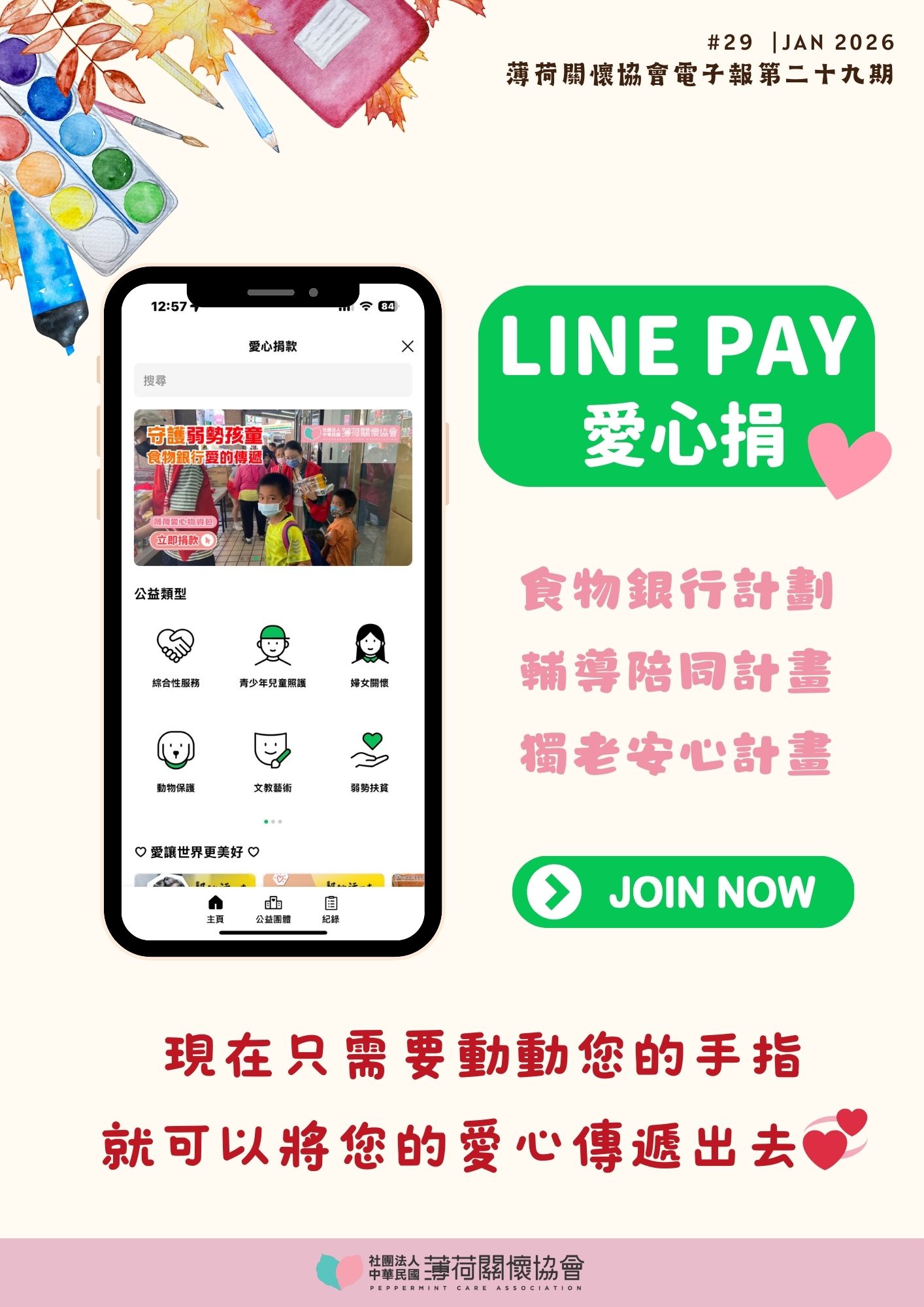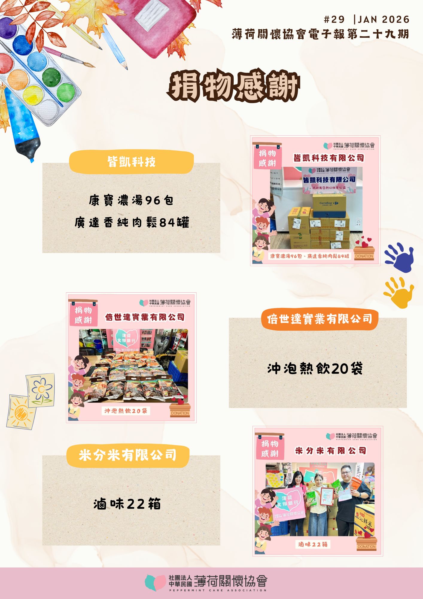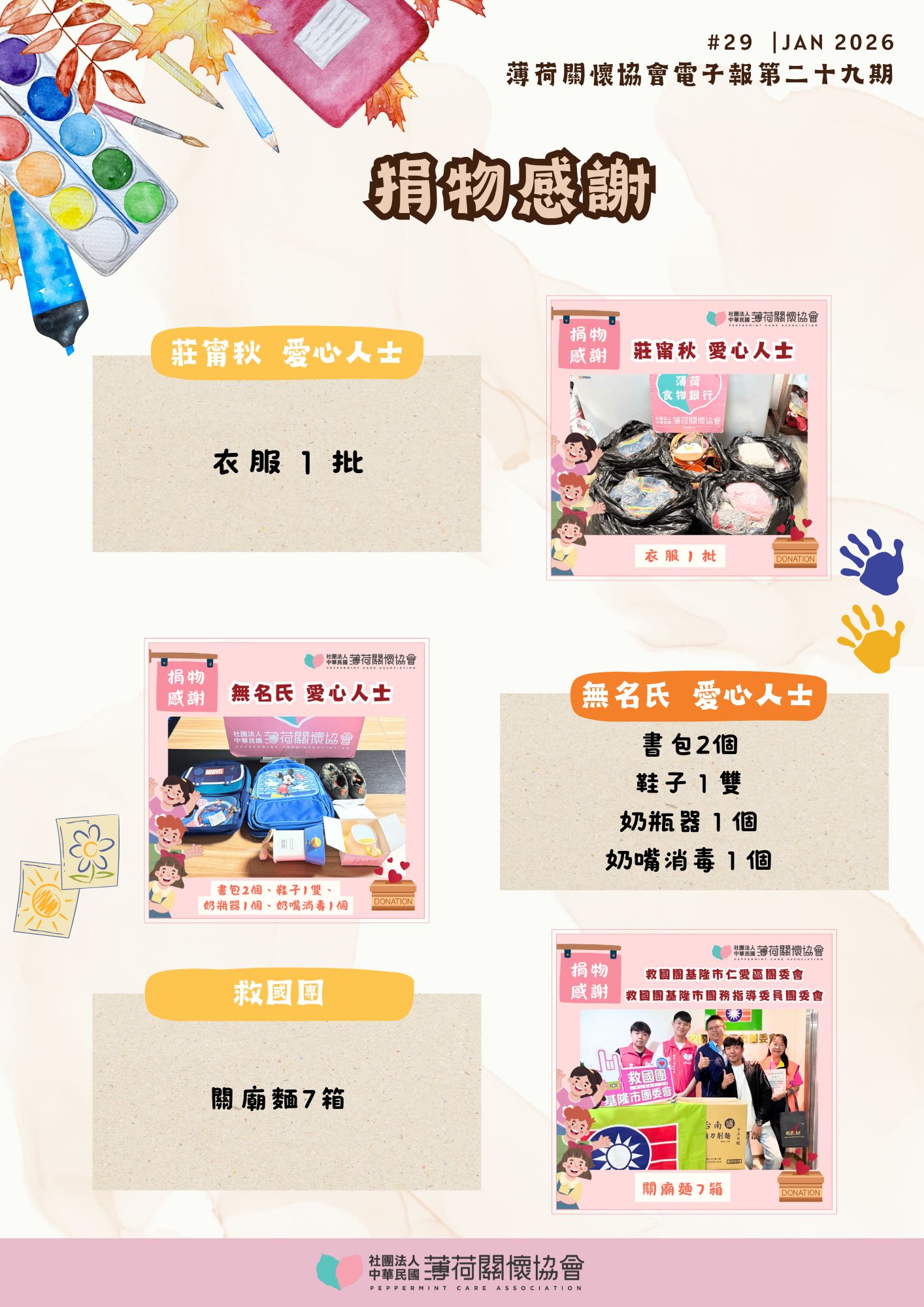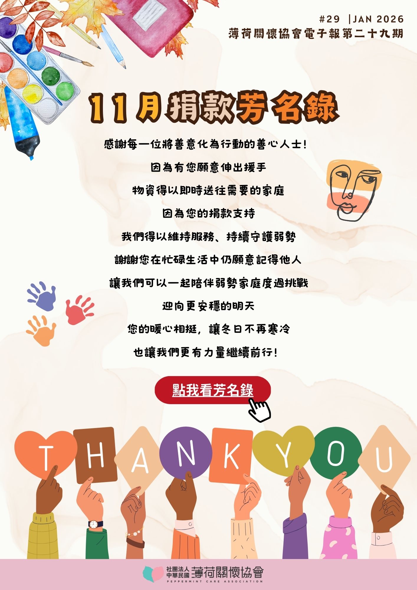 薄荷關懷協會始終相信,公益從來不只是把物資交到手中,而是讓人知道——在這個世界上,仍有人願意為你停下腳步。愛心沒有年齡的界線,公益人人都能參與。只要願意付出,哪怕是一個微笑、一雙伸出的手,都能在這個冬天,為他人帶來改變的力量。