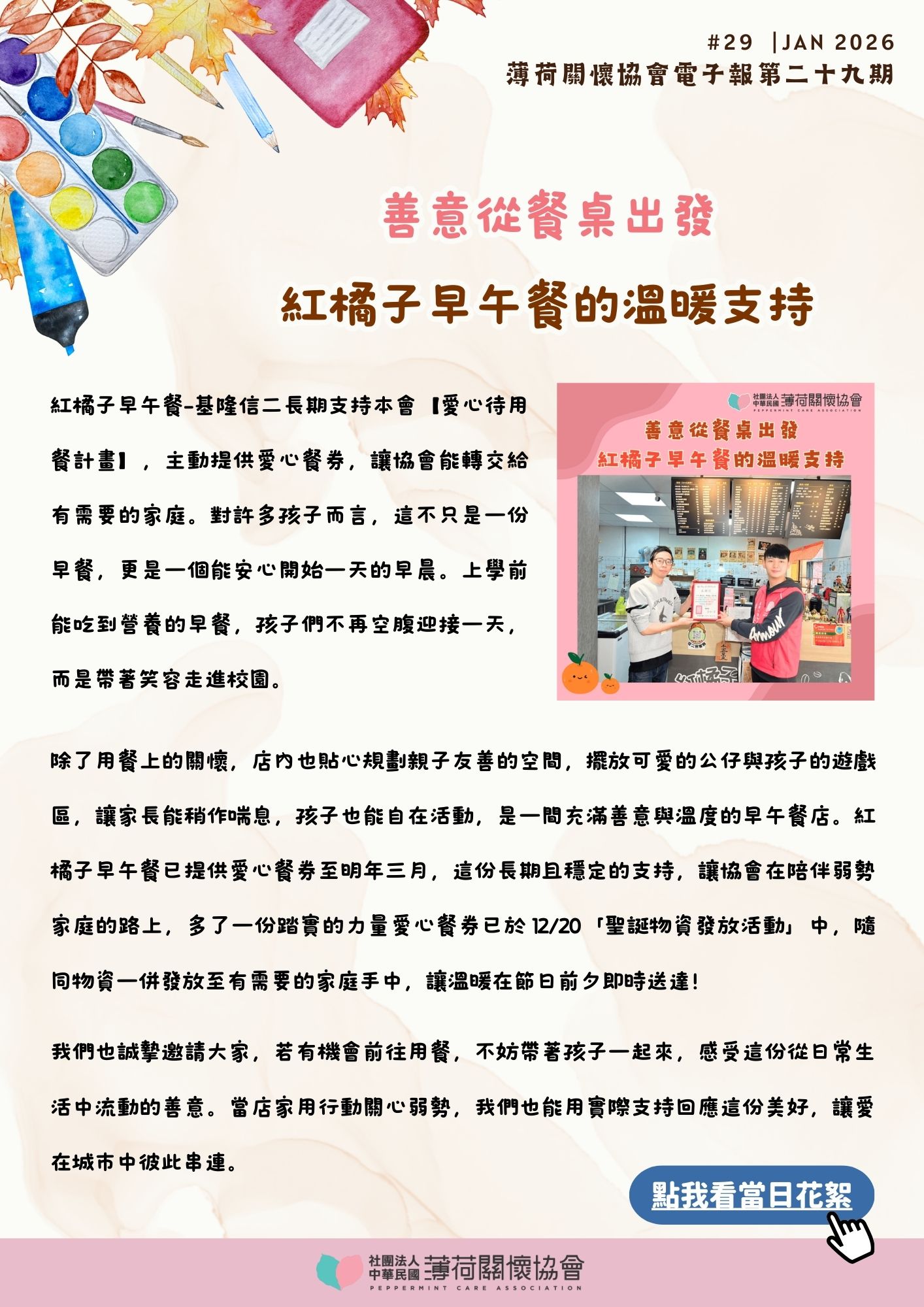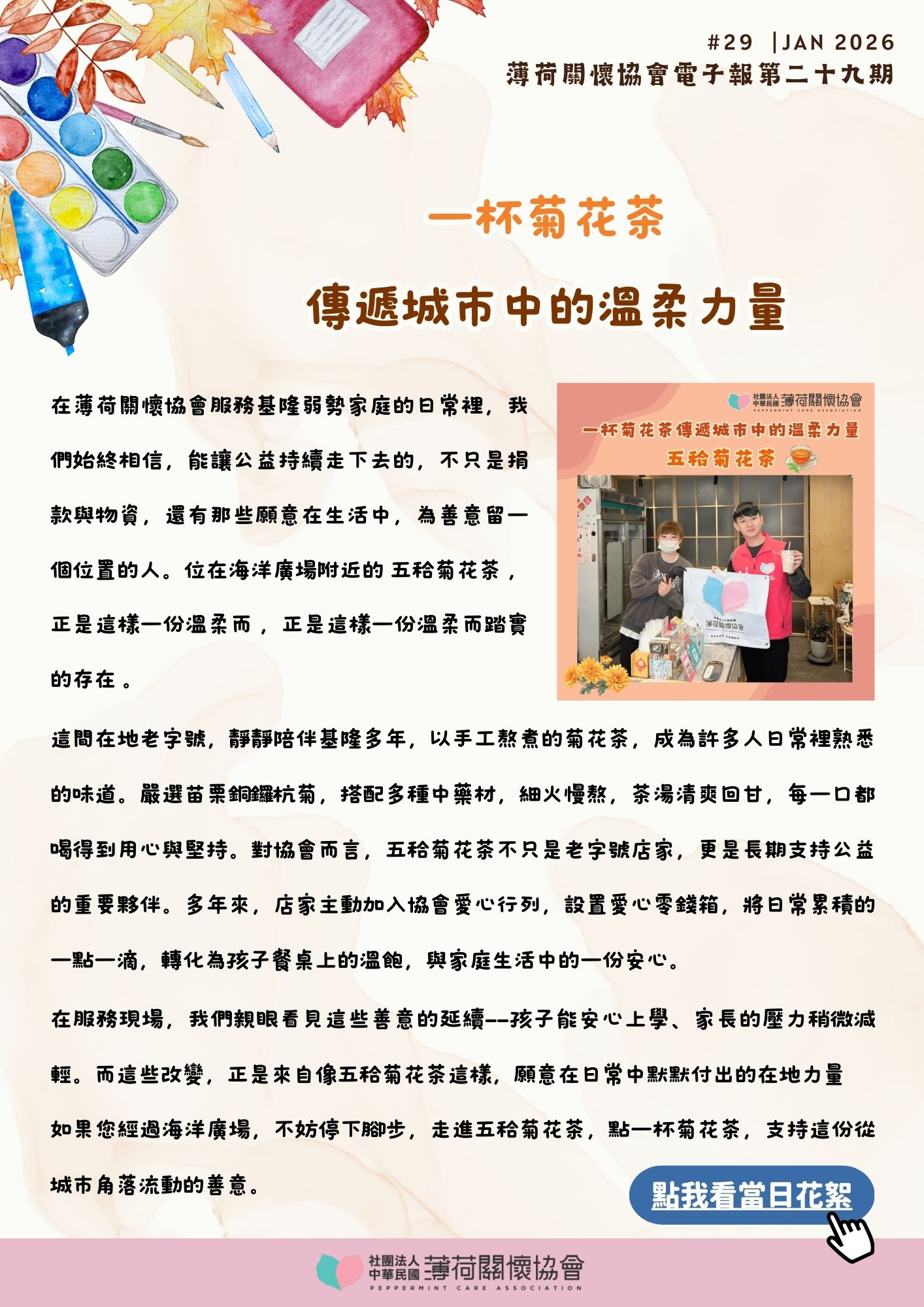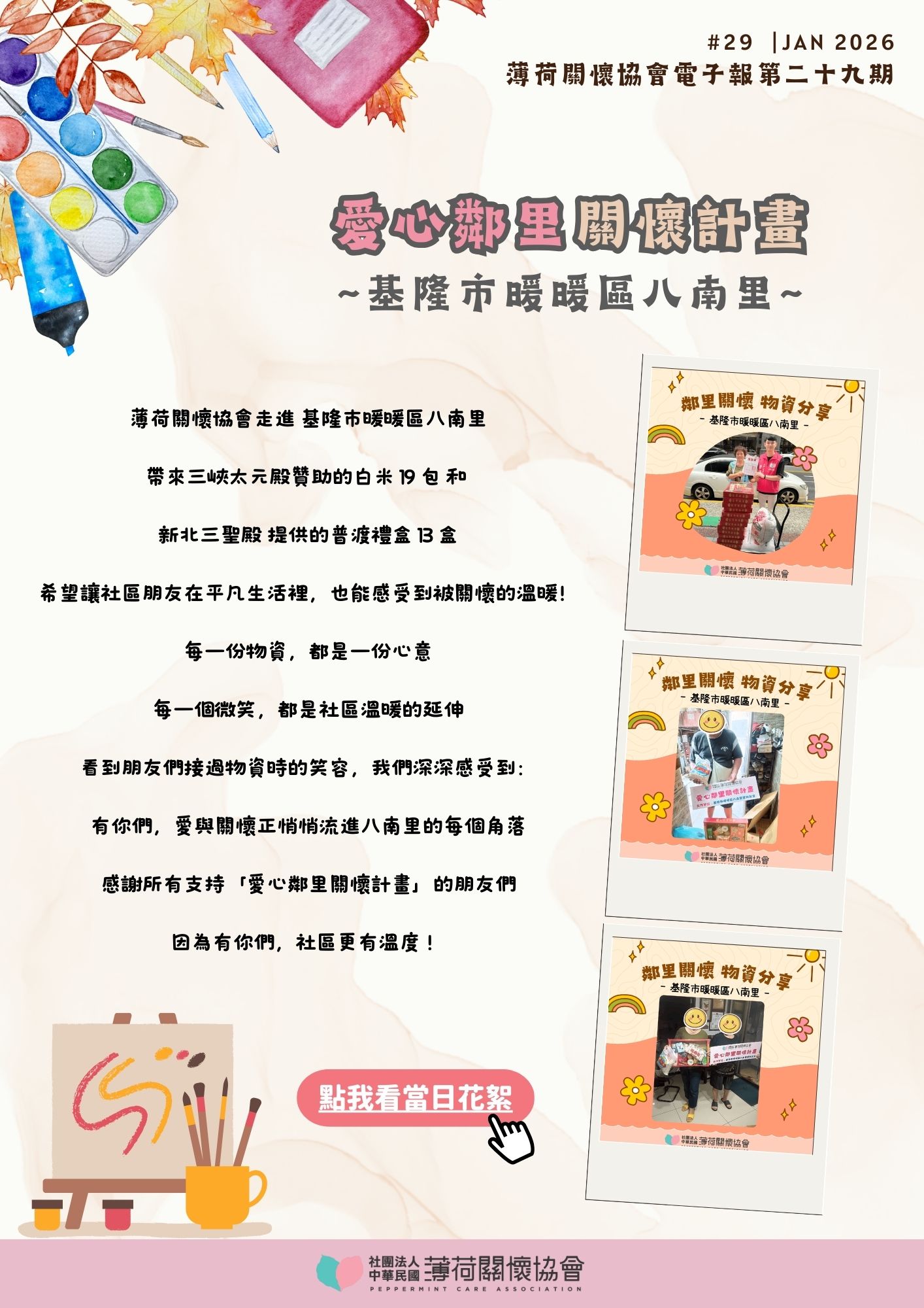 薄荷關懷協會始終相信,公益從來不只是把物資交到手中,而是讓人知道——在這個世界上,仍有人願意為你停下腳步。愛心沒有年齡的界線,公益人人都能參與。只要願意付出,哪怕是一個微笑、一雙伸出的手,都能在這個冬天,為他人帶來改變的力量。