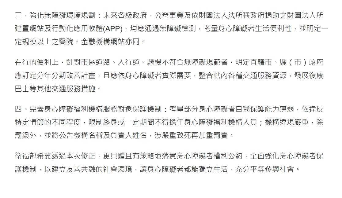 三、強化無障礙環境規劃:未來各級政府、公營事業及依財團法人法所稱政府捐助之財團法人所建置網站及行動化應用軟體(APP),均應通過無障礙檢測,考量身心障礙者生活便利性,並明定一定規模以上之醫院、金融機構網站亦同。