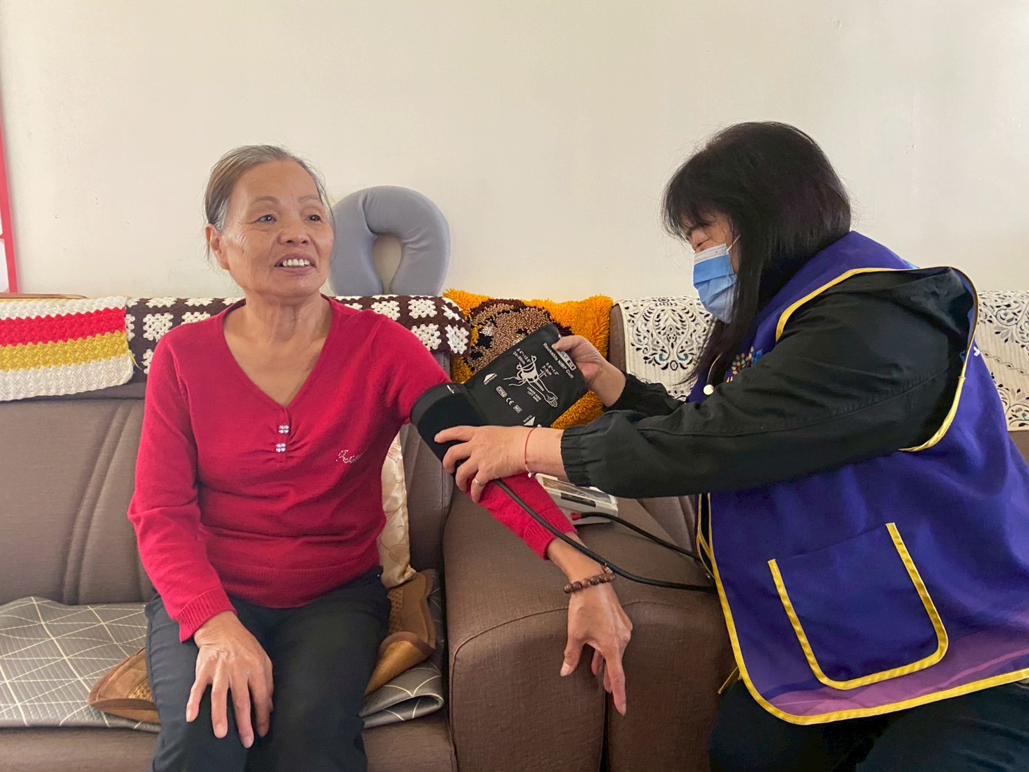 每周志工們都會帶額溫槍還有血壓機到獨居長者家提供簡易的健康測量,出行不便者也會陪伴外出領藥或是就醫,