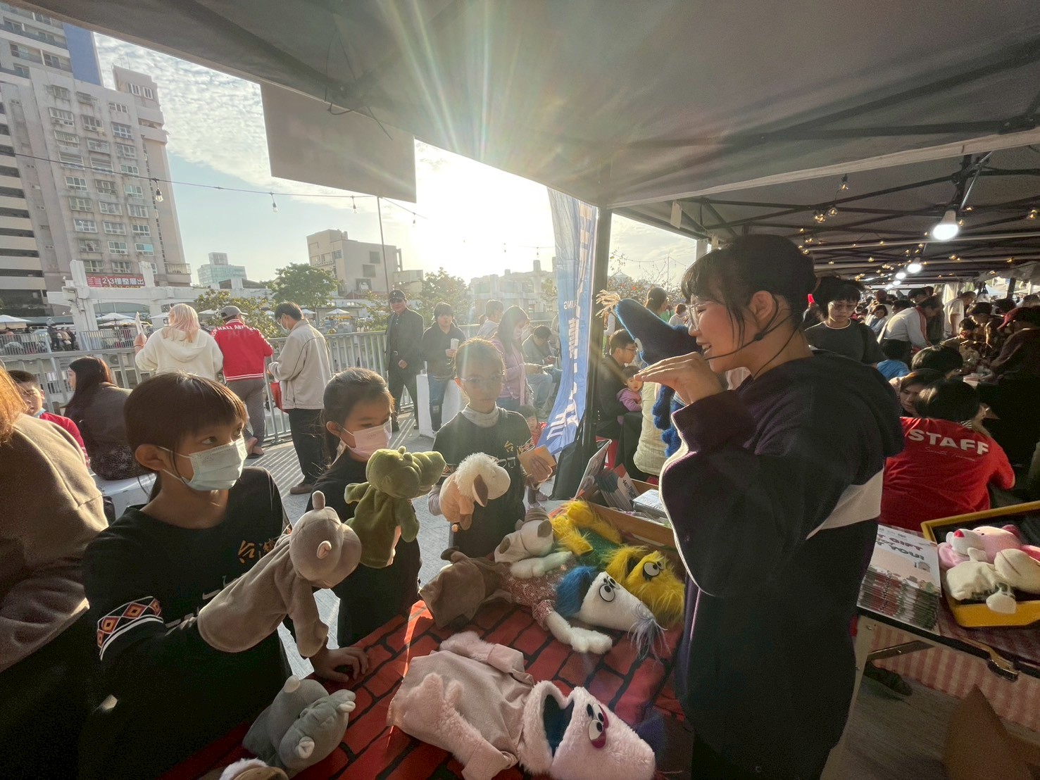 活動中,劇團帶來人型與動物布偶,邀請大朋友、小朋友實際體驗布偶操作。許多家長分享,看似簡單的動作,實際操作卻相當不易,更加體會表演背後的專業與用心。現場也有不少曾在幼兒園看過演出的小朋友,特地前來尋找布偶老師「粉條」,即便已畢業,仍對劇團留下深刻印象。