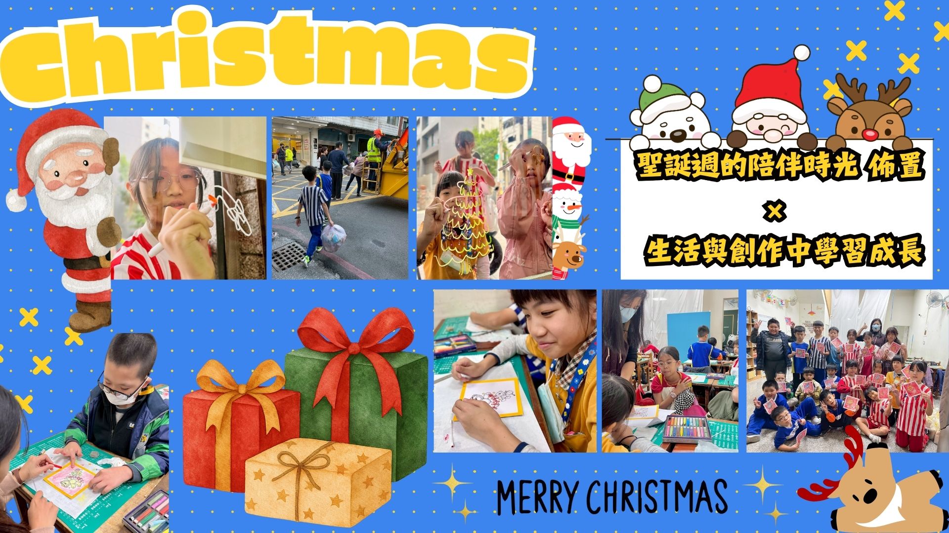 今年特別讓孩子們一起參與,從討論主題、查詢圖片,到動手繪製裝飾,每個環節都看見他們投入又認真的身影。孩子們學著用電腦搜尋想畫的圖案,一邊創作、一邊露出滿滿成就感的笑容,讓整個教室都充滿了濃濃的聖誕氣氛 😻