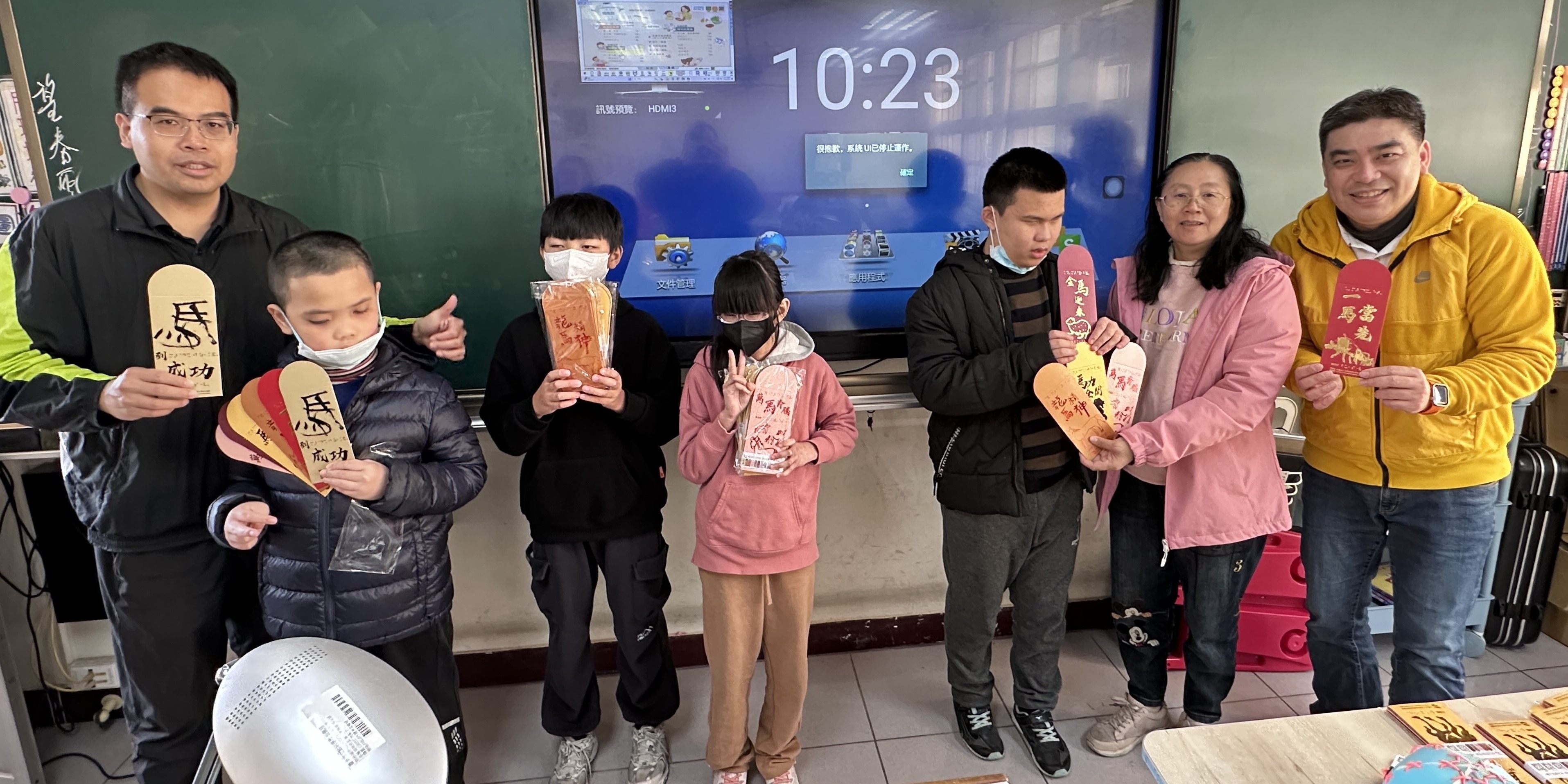 當他們用指尖輕輕劃過那些立體、有溫度的書法線條,感受到當初自己親手畫出的墨寶,真的變成了一件很有質感的實品時,驚喜與成就感躍然臉上。從照片裡可以看到,學生們拿著成品時笑得非常開心,這份成就感來自於發現:原來自己的創作可以跨越視力的限制,變成一份能傳遞祝福的禮物。這份認可,讓他們在創作的路上更有信心,也讓這些作品能帶著溫度,走進更多家庭的新年祝福裡。