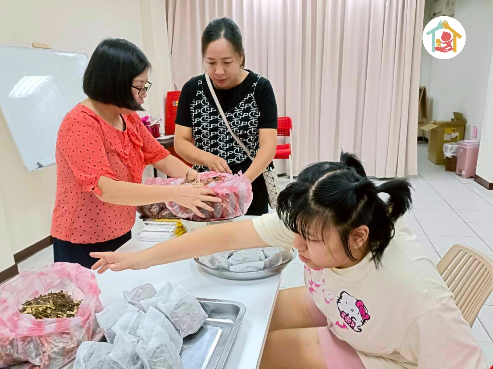 孩子們依照能力分工,有人剪葉片、有人分裝茶包,大人也在旁協助,大家一起完成香氣十足的伏冒飲茶包。圍在桌邊的溫馨畫面,讓人覺得不只是做手作,更是在做一份彼此的關心與連結。