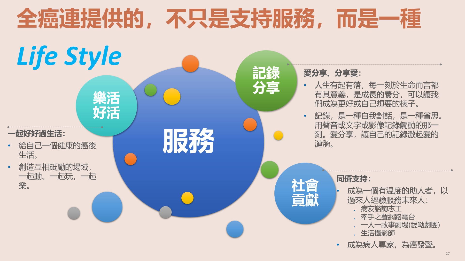 全癌連的服務,不只是支持性及關懷性的癌友服務,而是著眼於「同儕支持」與「病人專家」養成所設計與規劃的。鼓勵癌友以自身的疾病經驗為種子,依著自己的喜好及志趣,經由培力,轉化成助人的力量。我們的服務本質,不只在於「服務」本身,而是希望以服務為媒介,引導癌友活出正向、有意義的癌後人生。