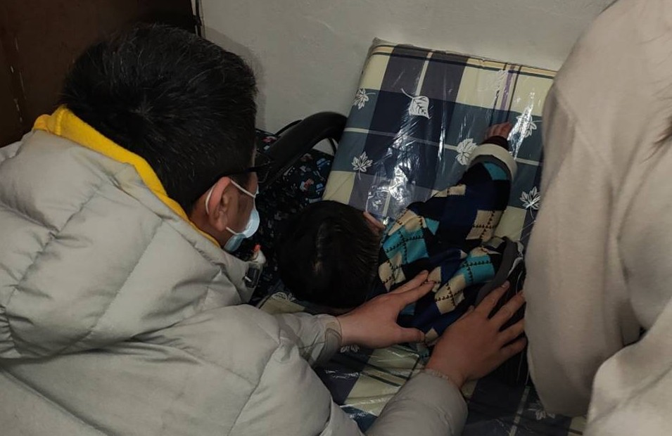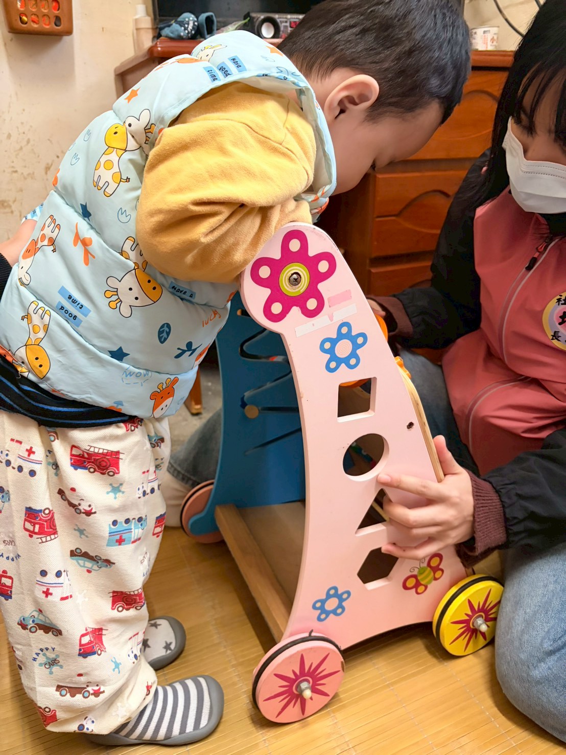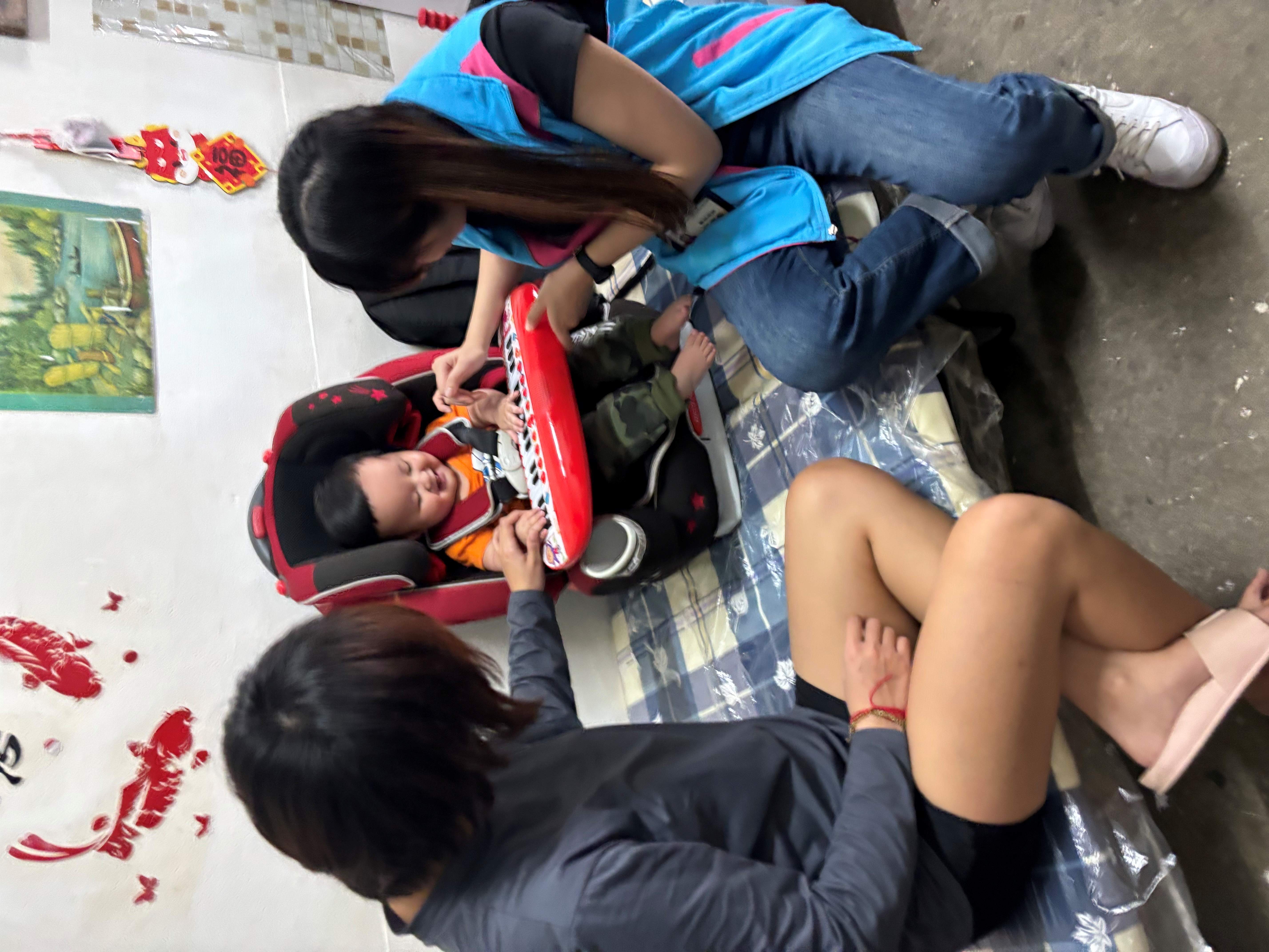 因基因突變引發罕見染色體神經發育障礙的端端,經社福中心社工轉介到據點。當時7個月大的端端眼神無法對焦,還不會翻身,手部力量也不足。物理治療師每月2次到端端家提供評估及復健指導,教保老師依據治療師評估建議在每週到宅上課時,引導端端從趴著抬頭、翻身、坐著玩等逐步練習起。同時,社工仍積極的連結各項資源,協助端端能順利到院復健、就診。經過13個月的努力,當端端穿起學步鞋,手握學步車站立的瞬間,老師難掩興喜。對端端及家人們來說,每一步都很不容易,讓我們一起加油吧!