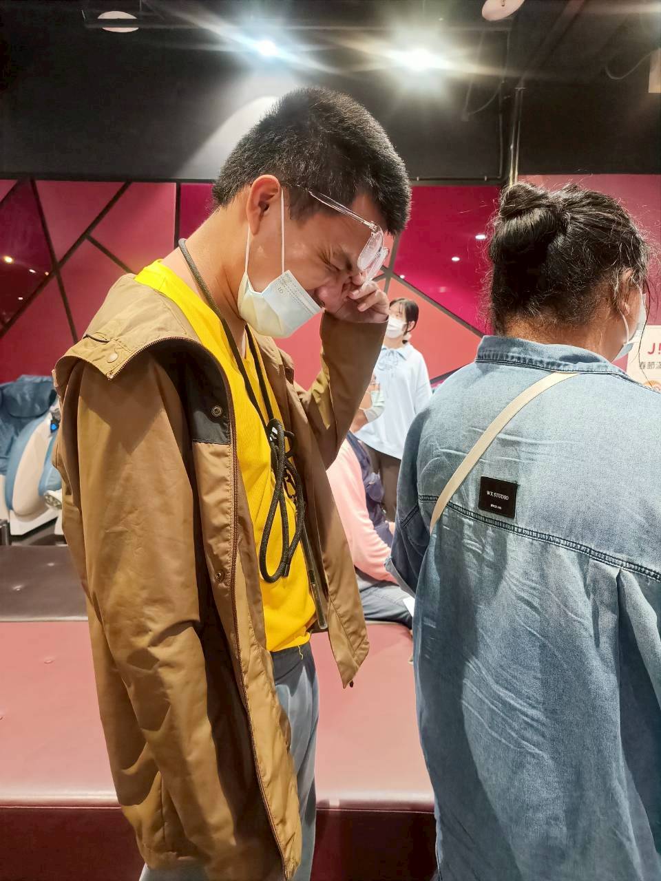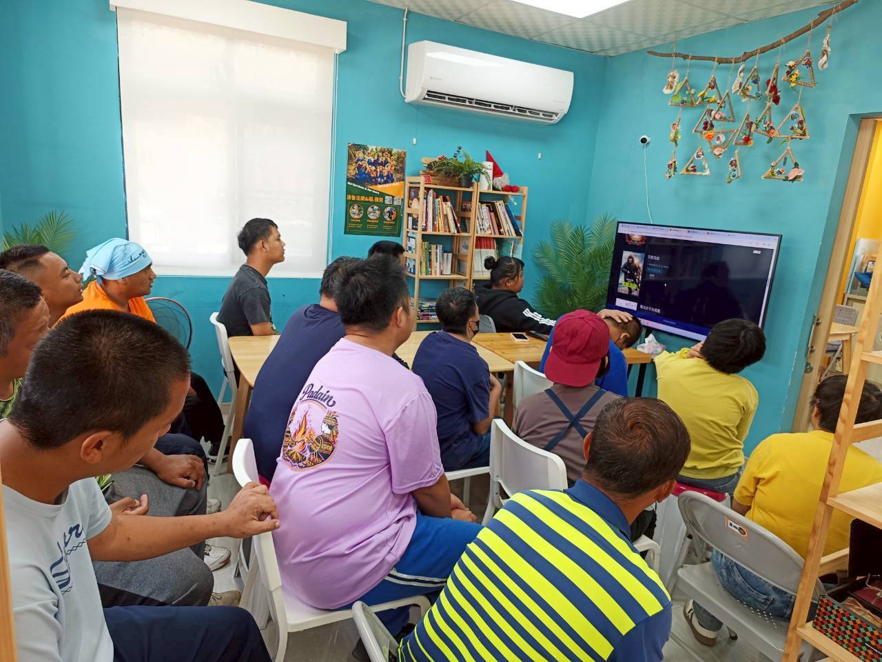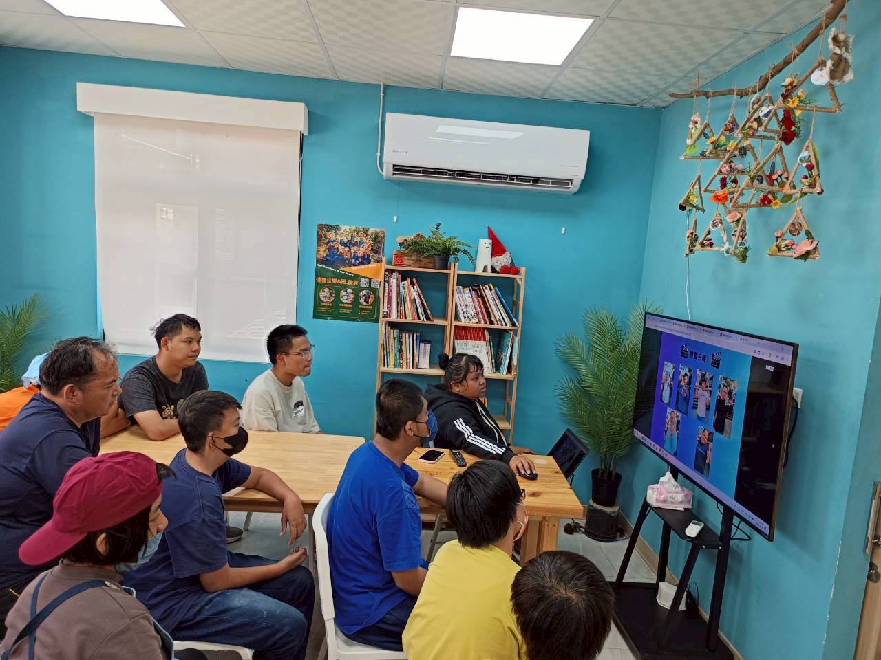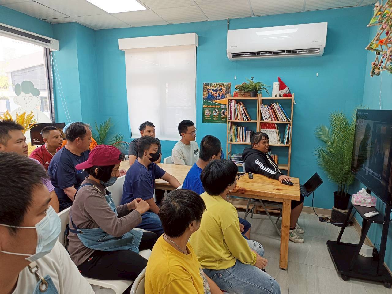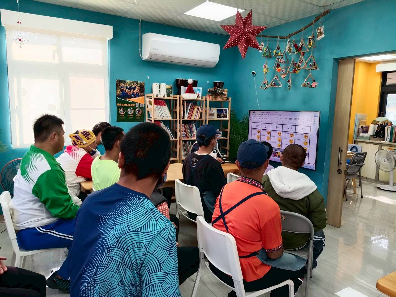 1.環球影城行前教育:服務使用者認真地看著影片並聽教保員說明影片內容,對於去戲院該注意的事項,可以有更完整的理解。