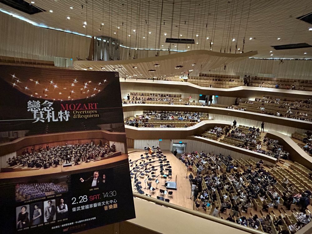 每年總會都收到企業贊助高雄市雄頌管弦樂團的慈善公益免費入場票,今年照樣在過年後的228連假,有幸參與該樂團辦在衛武營國家音樂廳的演出,演出主題是「戀念莫札特」,除了原本的管絃樂團之外,也邀請中山大學的校友合唱團及四位男女聲樂美聲演出。