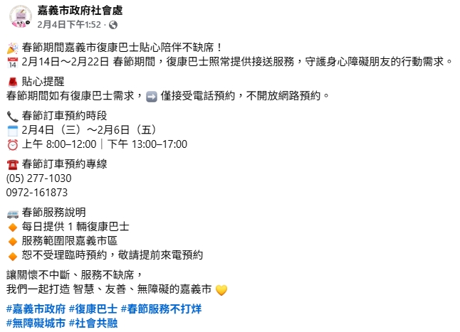 圖片一:嘉義市政府市政處-春節期間嘉義市復康巴士貼心陪伴不缺席