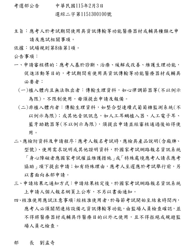 【應考人於考試期間使用具資訊傳輸等功能醫療器材或輔具種類之申請及應試相關事項】