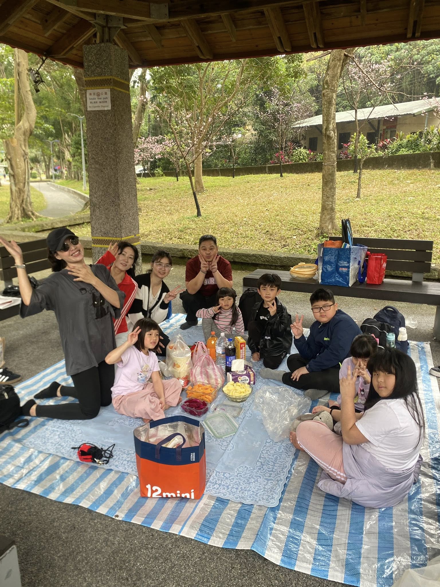 原預計打羽毛球,可惜天氣不好,但卻不影響大家出遊的心情,我們開心的在涼亭野餐,唱唱跳跳歌舞群起。