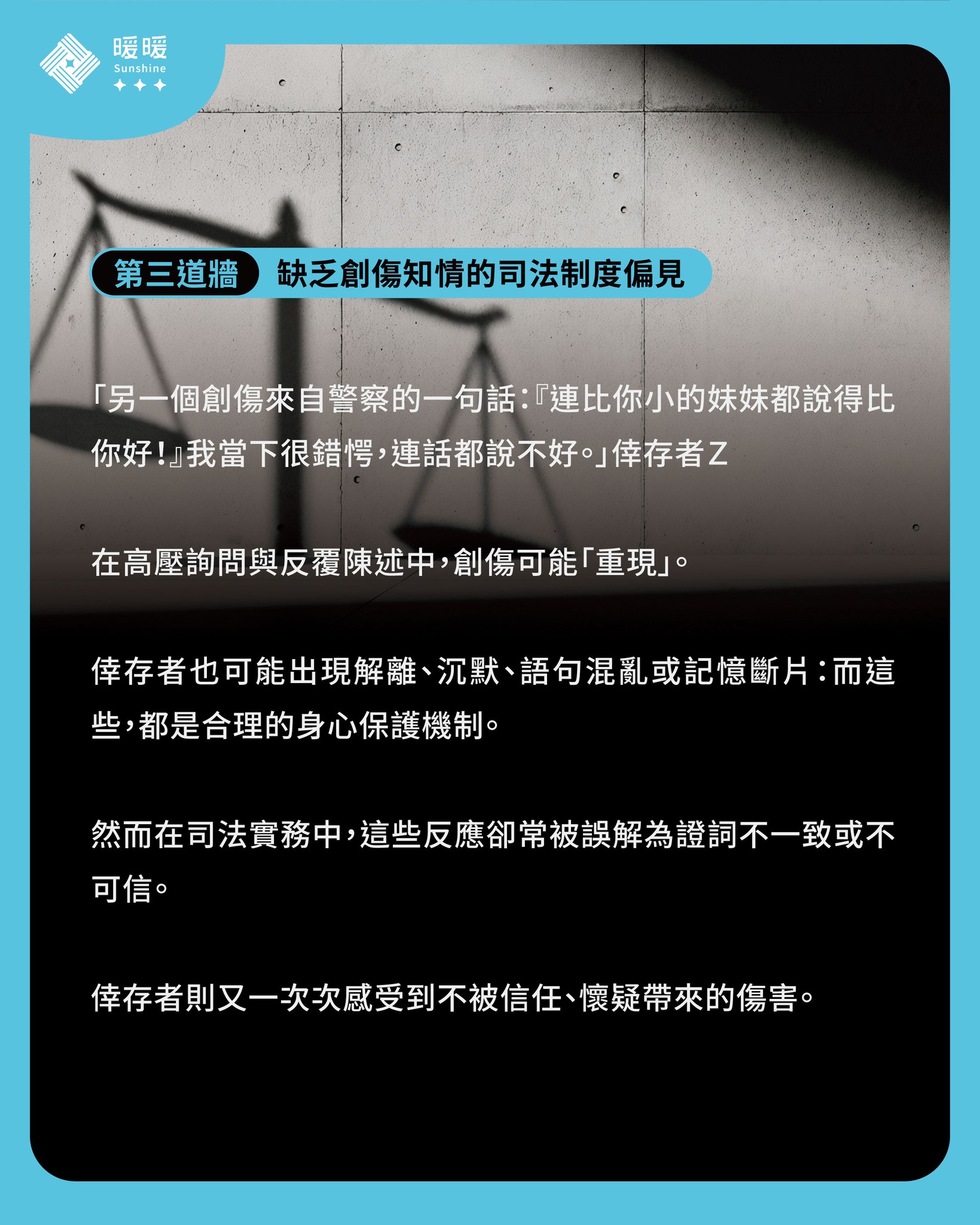 - 建立創傷知情司法機制,引入具性創傷專業知能的專家參與判斷。