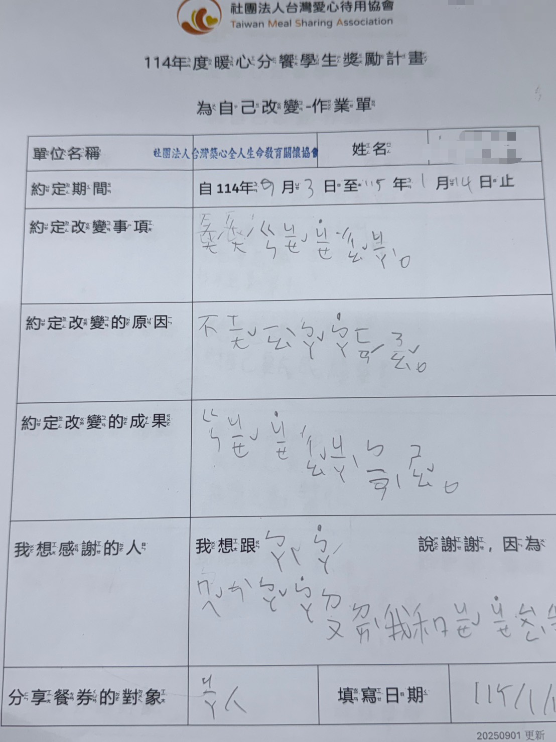 感謝台灣愛心待用協會分享待用餐券,為這段改變的歷程增添一份溫暖力量。孩子們不只寫下目標與原因,也記錄努力後的成果;在寒令營結業式中,一同享用拿坡里披薩,並將這份溫暖帶回家與家人分享。