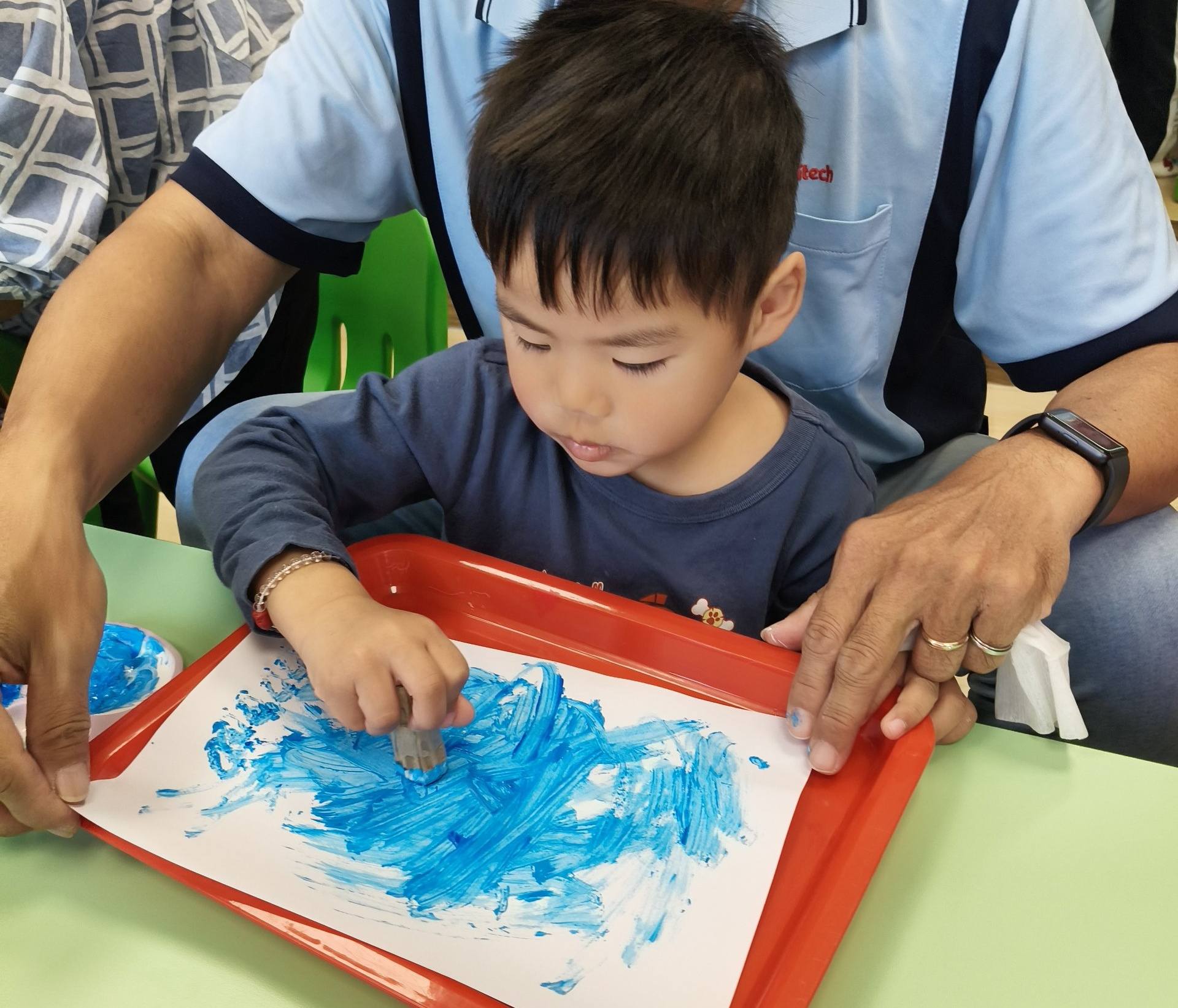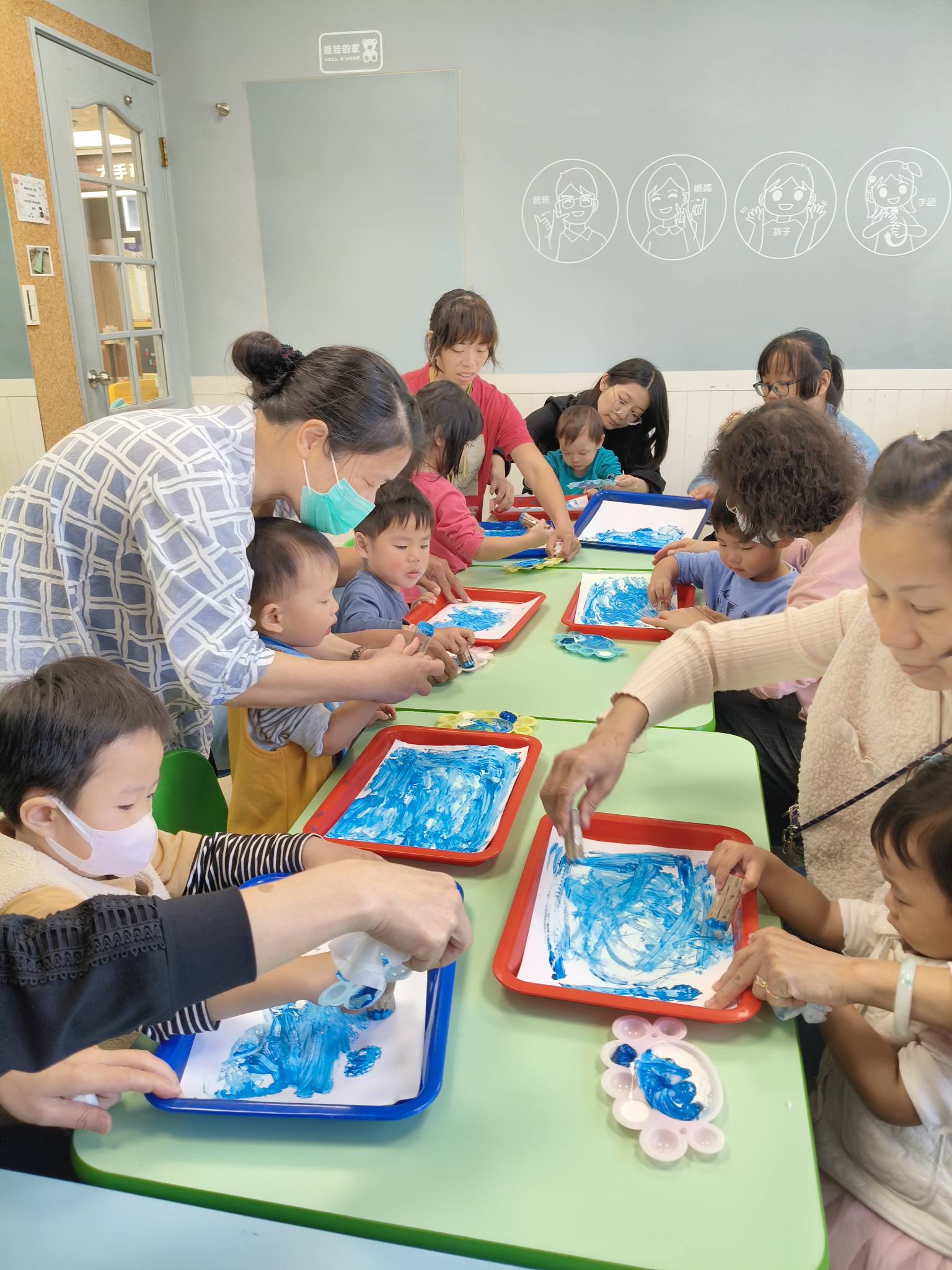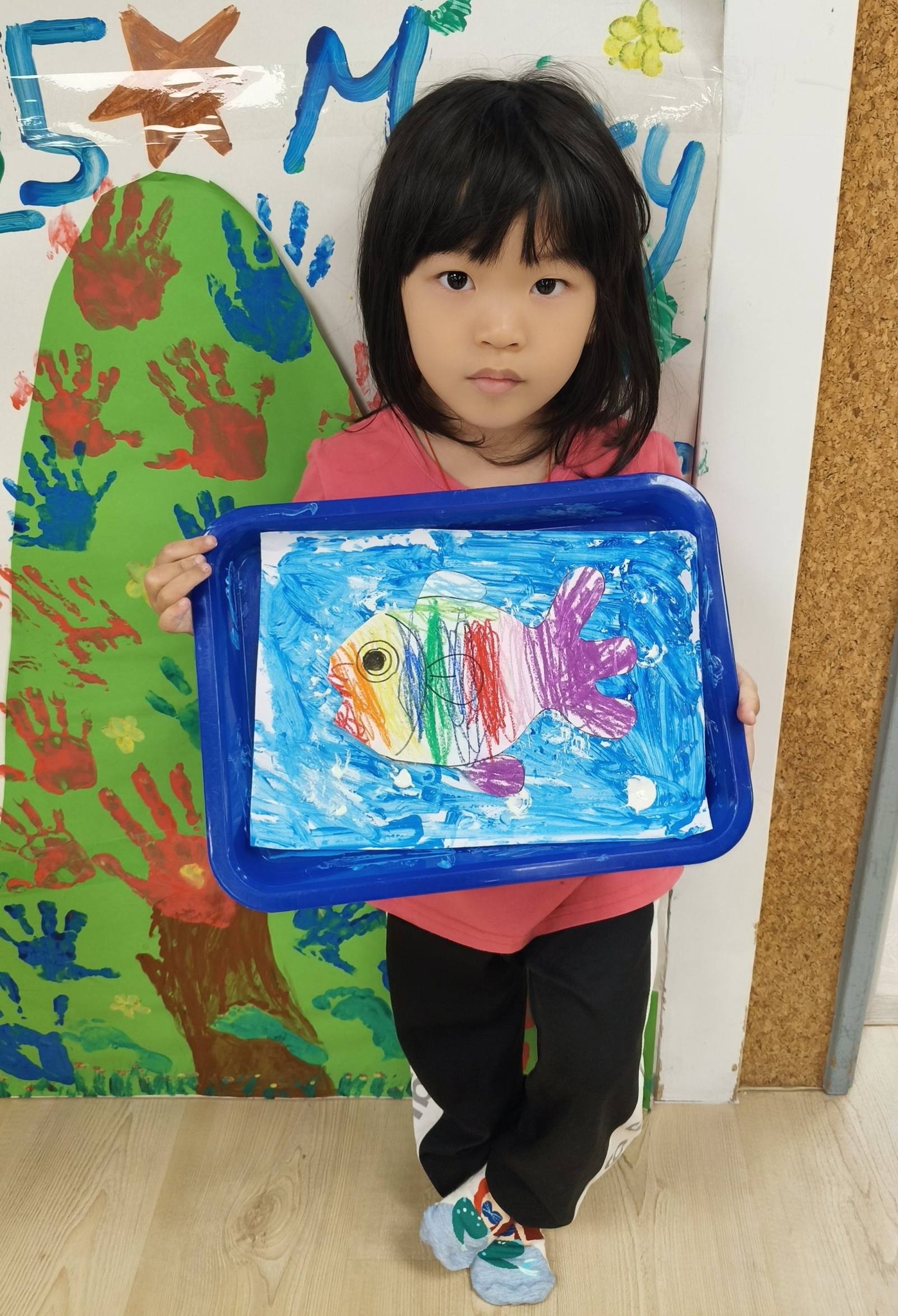 創意塗鴉課程,孩子們用手指膏顏料塗抹出一片大海,充滿創意的彩色魚作品就完成啦。