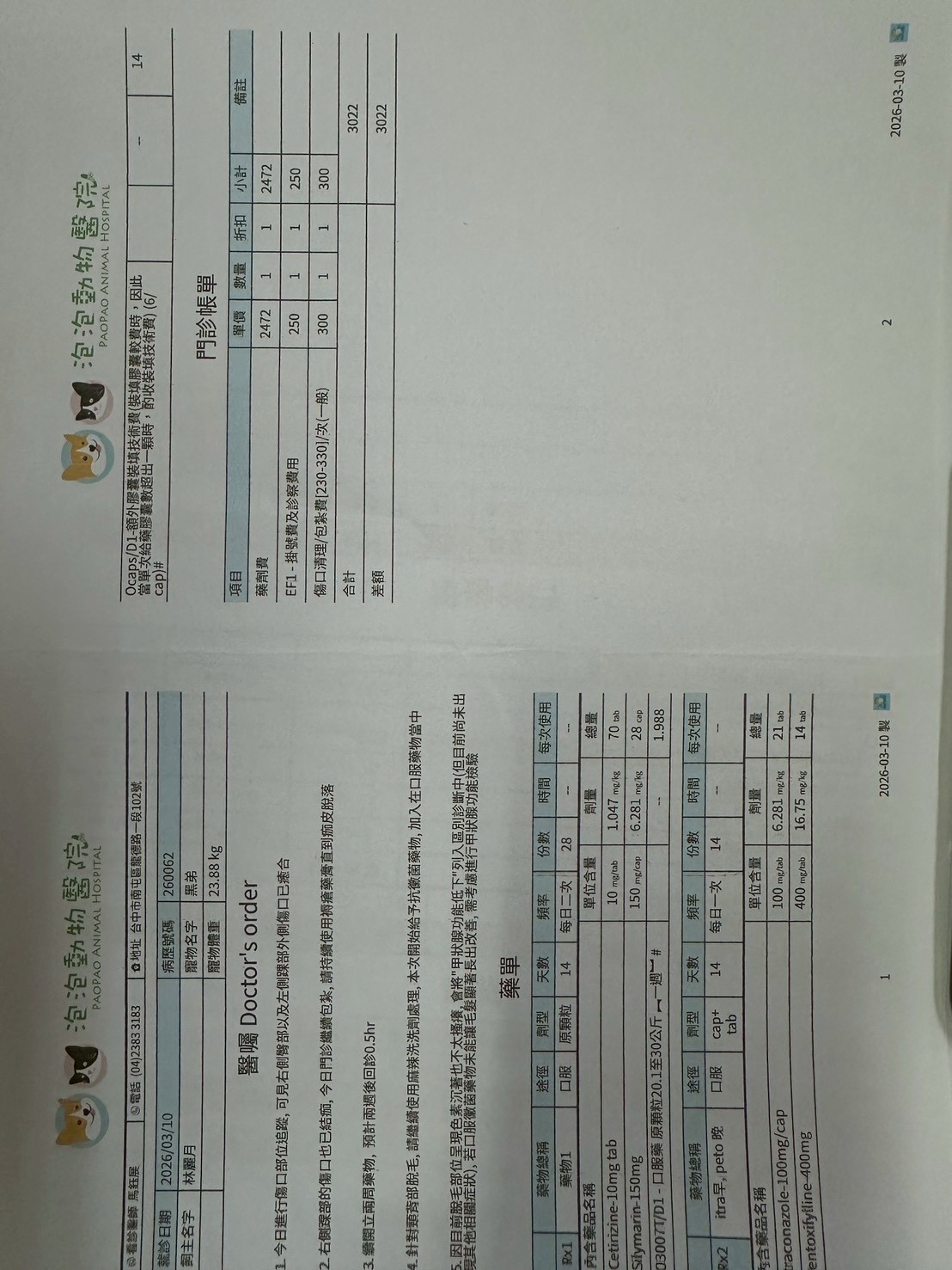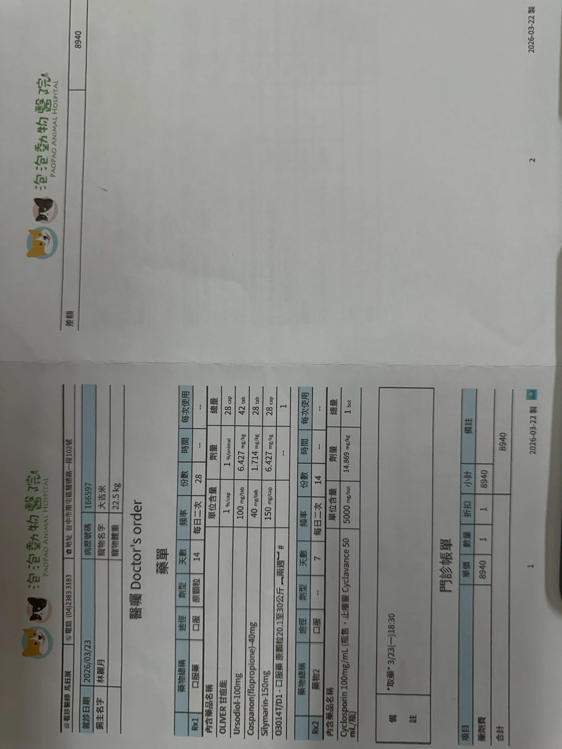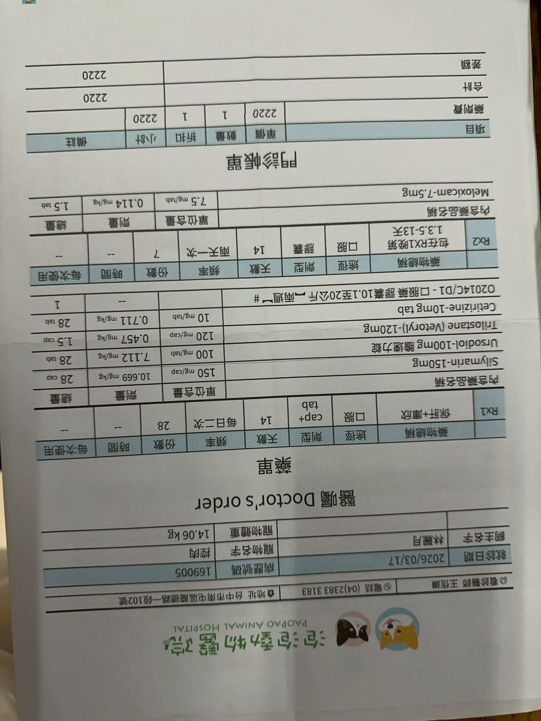動物和人類一樣,隨著年齡的增長,身體機能會逐漸退化,更容易出現各種疾病~近期照護員觀察到個性相當內向的-黑弟,出現多喝、多尿等反常情況~安排就診後,也確診為庫欣氏症了~未來將以藥物治療進行控制,並規劃定期回診追蹤及相關檢驗,以監測病情變化。以下是黑弟三月份的醫療費用收據。($10936)