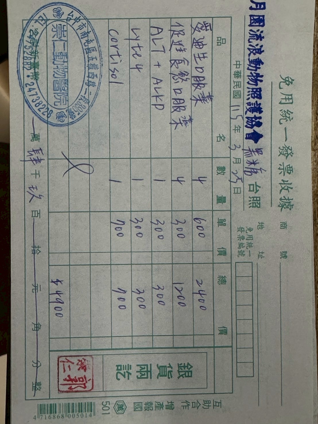 患有愛迪森氏症的黑糖~本月例行回診檢查肝指數及電解質皆正常!獸醫師對照護員們的努力付出讚譽有加!因此繼續開一個月的口服藥,藥吃完後再回診追蹤即可!不過日常還是得持續細心觀察~不管食慾、水量、精神狀況及其他病兆,都不能掉以輕心,須隨時回報其他照護員們於群組和醫生討論是否有提早回診或調整藥物之必要,以下是三月份黑糖的醫療費用收據。($4900)