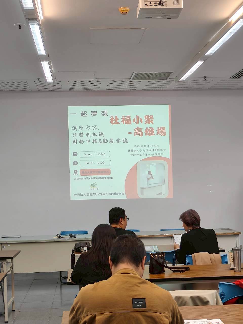 115/3/16 今天一起夢想的社福小聚在高雄的大東文藝中心舉行,請來了財團法人台南市佑明視障協會江茂坤社工師,介紹了非營利組織的財務申報以及勸募字號,內容非常精闢也讓我們了解了更多有關財務以及對外捐款的細節,非常感謝一起夢想經常舉辦一些活動來造福微型社團。