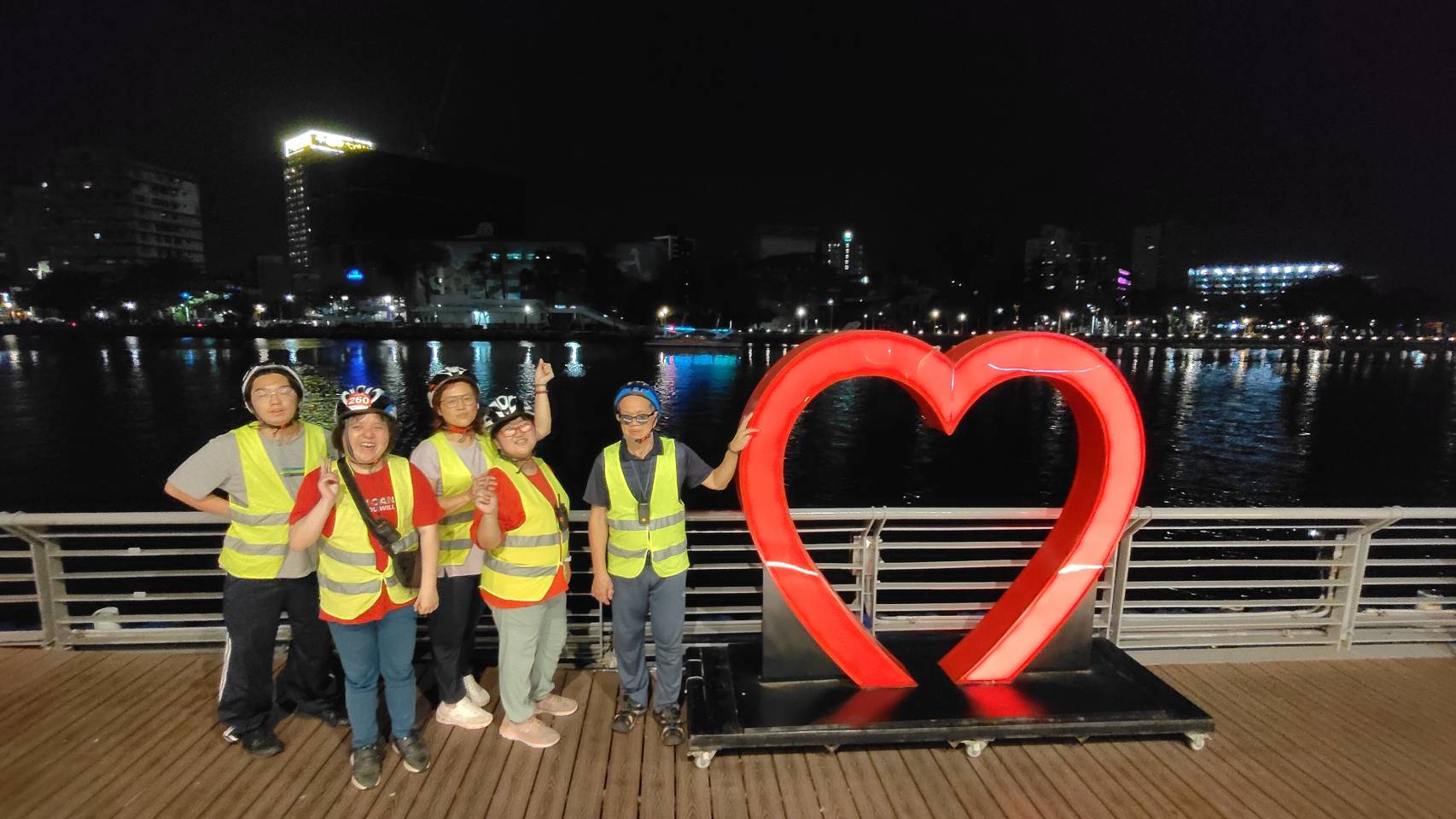 115/3/21 夜騎活動從因為某些因素過年到現在已經很久沒有辦理了,有幾位固定來夜騎的視障朋友,也因為開刀人在復原中,所以這次來參加活動的人也特別的少。感謝中山大學畢業生永奇剛好到高雄旅遊也搭他父親來加入我們志工的行列。今晚我們先騎到五福路吃了鴨肉餐點和豆花,就往愛河前進,一路沿著同盟路騎到自由路才往回騎。全程騎了20多公里,所以也將近才結束這次的活動。