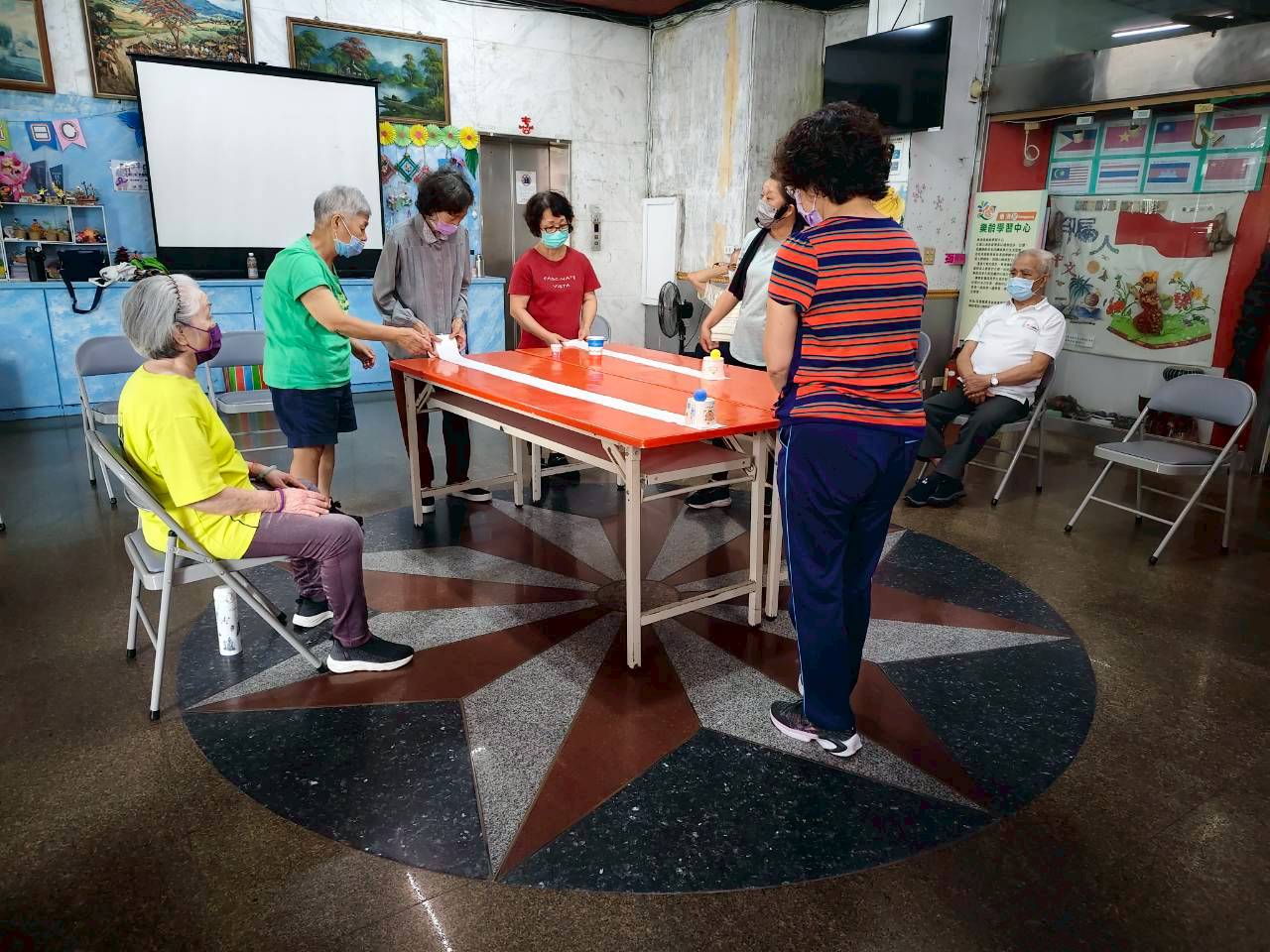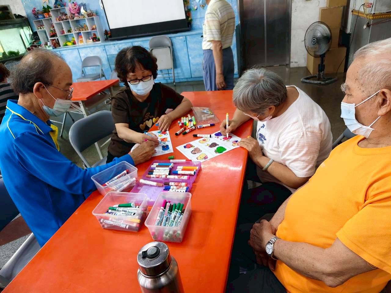 長輩們一到據點,就會開始讓他們先熱身活動,像是運用毛巾進行簡單運動操,又或者是簡單跟隨著音樂舞動,讓長輩們能夠醒腦也能夠好好活動一下筋骨。接著進行有趣的拉紙杯活動,運用衛生紙來拉動紙杯,一個簡單但是需要運用力道控制的小遊戲,讓長輩們都玩得不亦樂乎,同時又能訓練到手部肌肉。最後讓長輩們進行較為文靜的繪畫著色,每個長輩都發揮創意,揮灑著色筆,讓圖案顯得繽紛可愛。