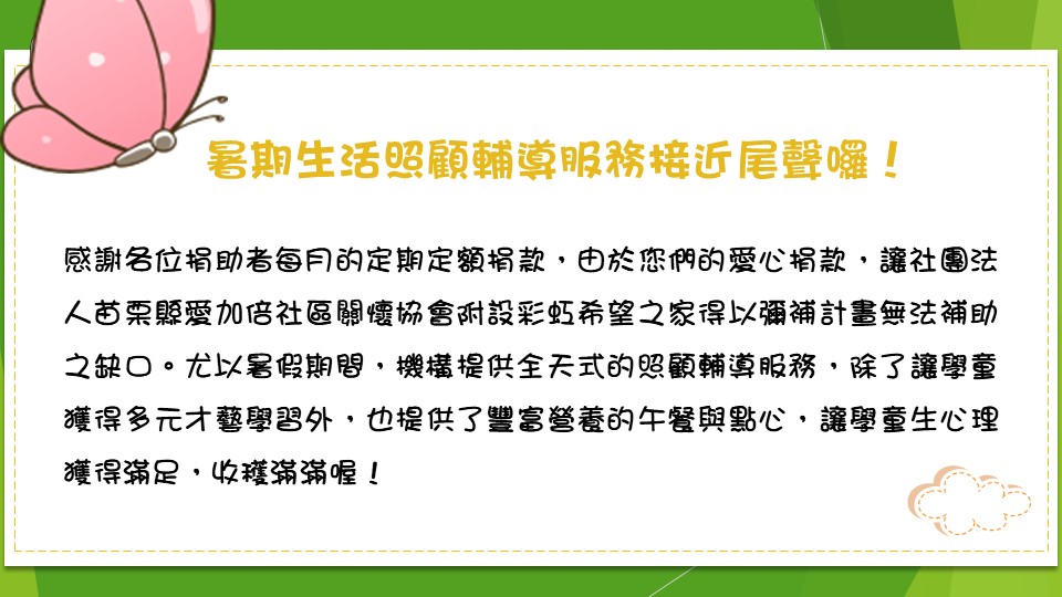 謝謝各位持續捐款支持「「社團法人苗栗縣愛加倍社區關懷協會」」,與您分享上個月的協會大小事與款項使用狀況。