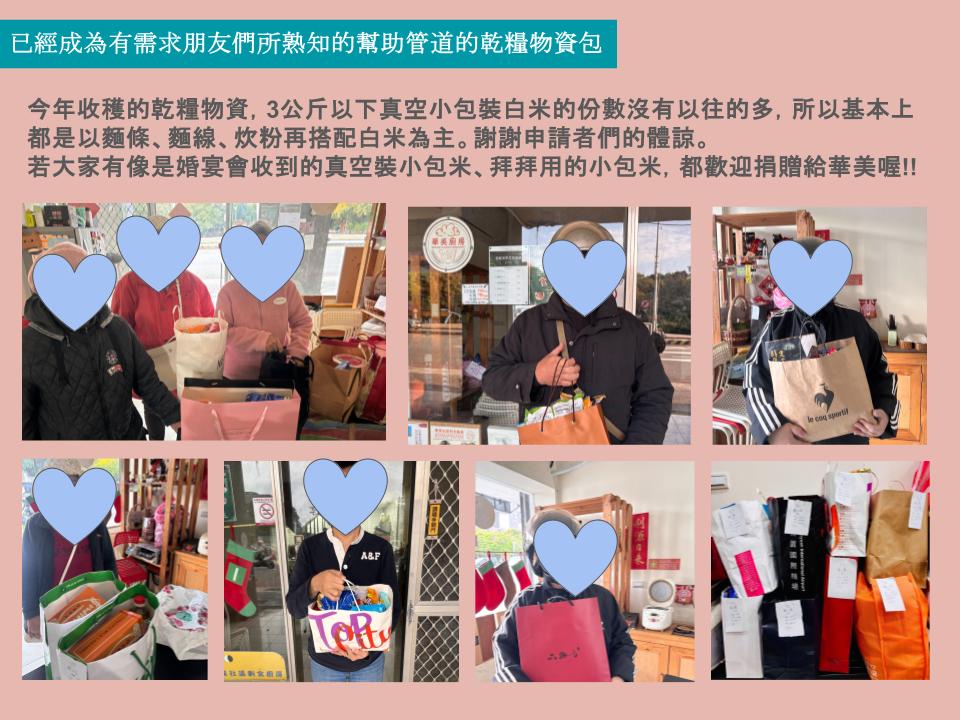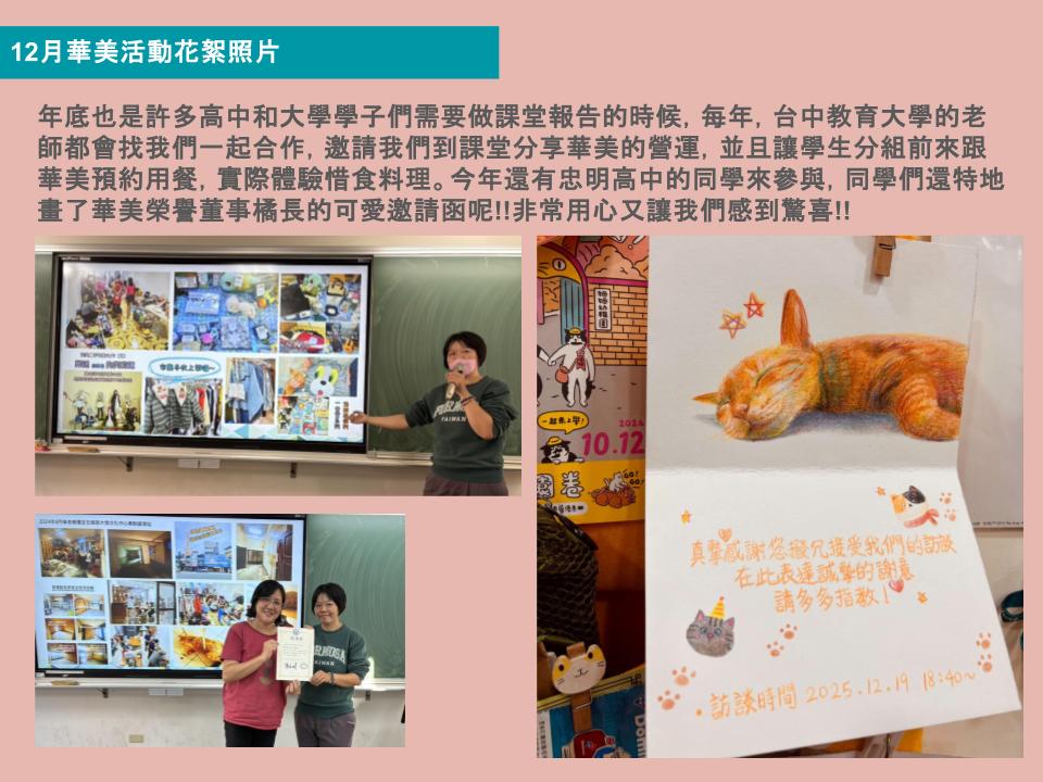 日子過得飛快,轉眼間就是2025年底了。總覺得今年也是一直在忙碌當中度過,細細回想今年的協會事務,也是從年初便不停在進行著『逐一歸還前年度為了進行搬家裝潢而借的款項且還清』『再繼續存錢逐項計畫強化據點的功能』包含空調、照明、洗手間、儲藏室、汰換尺寸不合的桌椅等等。每次更新了一個地方,都讓用餐的朋友們感到華美正實際在進步當中的樣子,也許不是直接給予他們糧食物資和金援,但當他們每次來到華美舉凡用餐、免費拿菜或是參與講座、市集活動等等,都可以越來越舒服開心。至少到了盛夏,吃飯和舉辦活動時,大家都不用再忍受悶熱的空氣啦。
