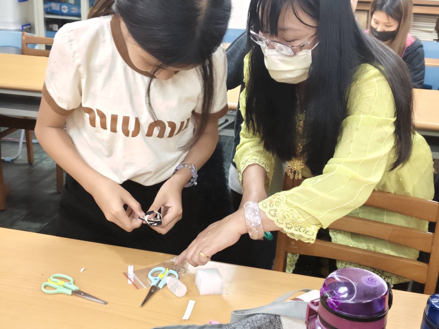 一開始,大家動手製作色彩繽紛的蠟染布吊飾,