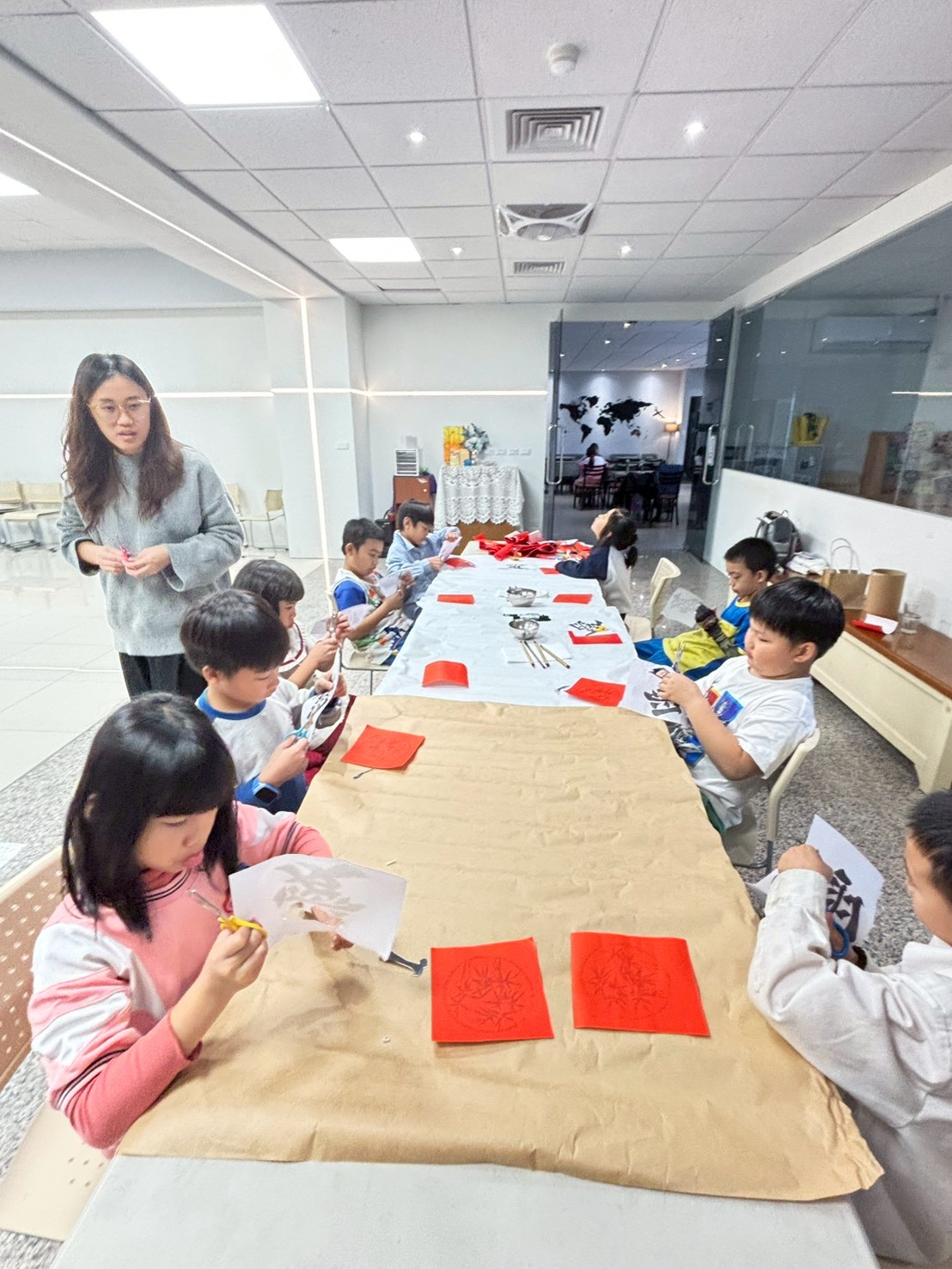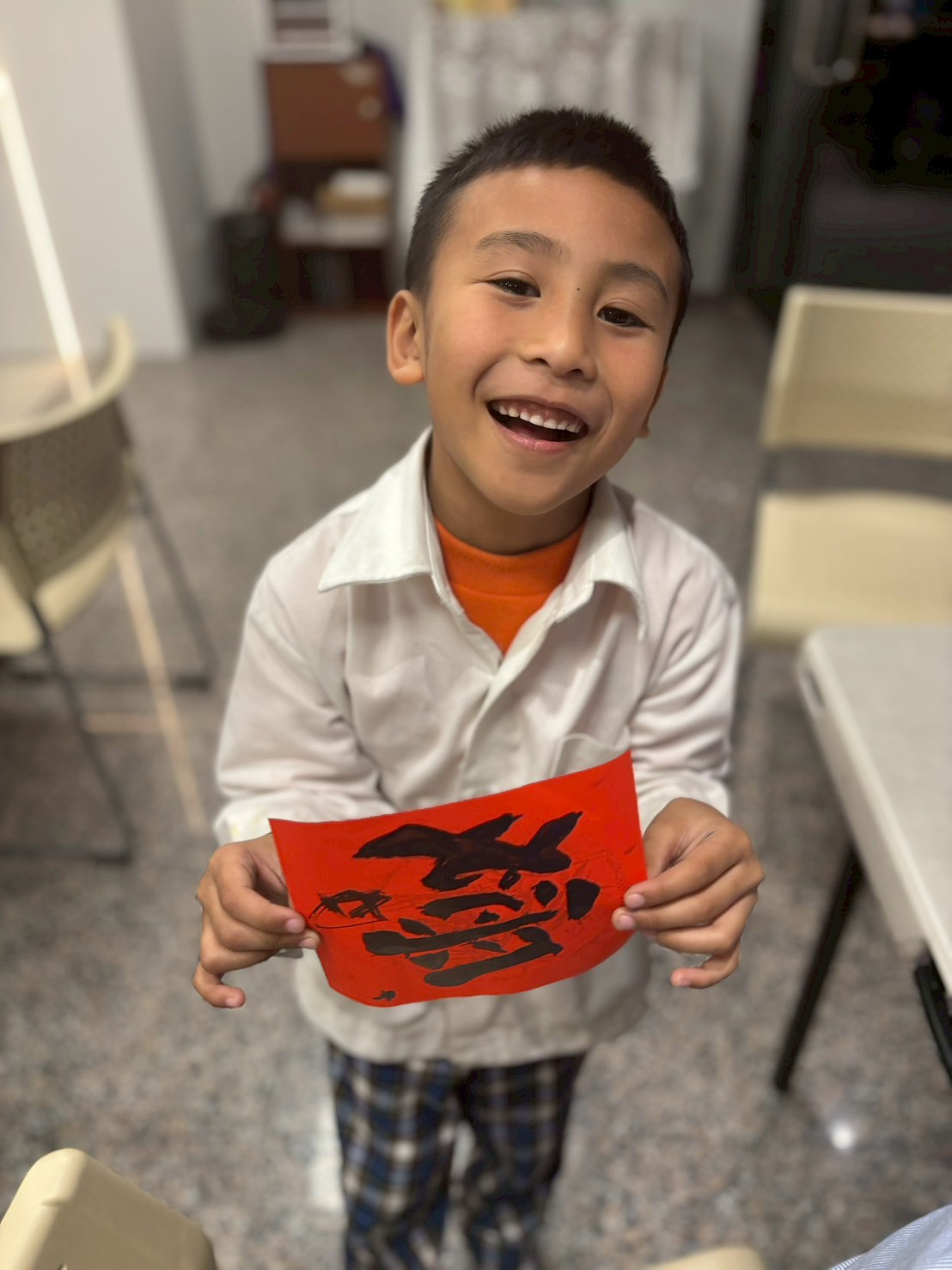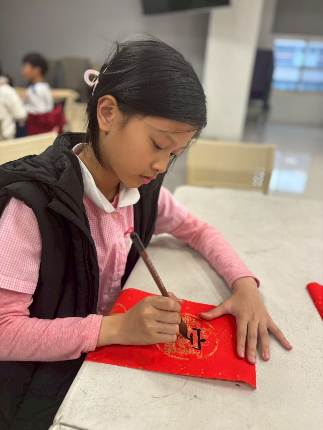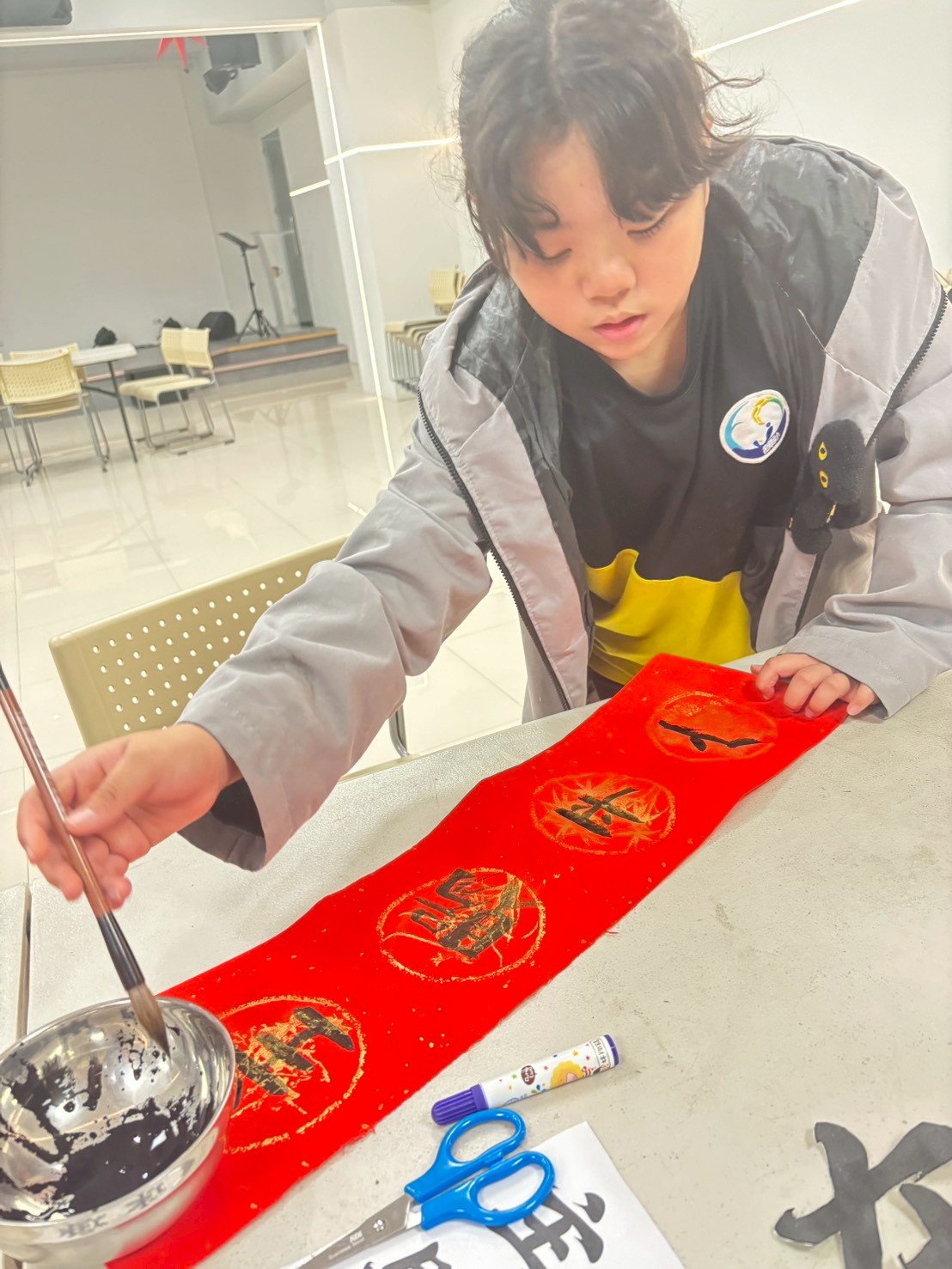 孩子們利用寫完作業的時間體驗寫春聯,在一筆一畫中認識年節文化,也學習專注與耐心;