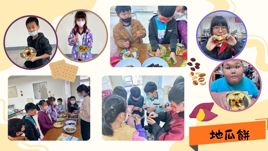 過程中,教室裡充滿討論與笑聲,每一塊地瓜餅也因此變得獨一無二。小天使們發揮創意,將完成的地瓜餅夾進蘇打餅乾裡,再加入蔓越莓與堅果,不僅增添口感層次,也讓點心看起來更加繽紛可愛。最後,大家還利用這些食材為自己的作品做裝飾,讓每一份點心都成了專屬的小創作。