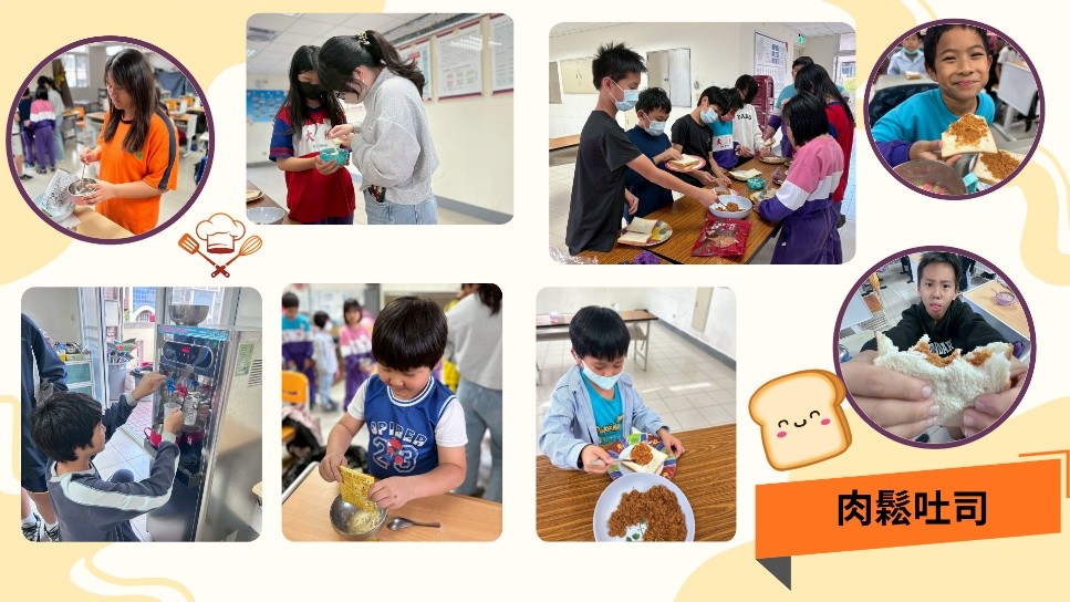 在手作點心課中,小天使們動手製作香噴噴的肉鬆吐司。操作流程簡單、容易上手,大家都在短時間內就能完成屬於自己的作品,臉上也自然浮現滿滿的成就感。