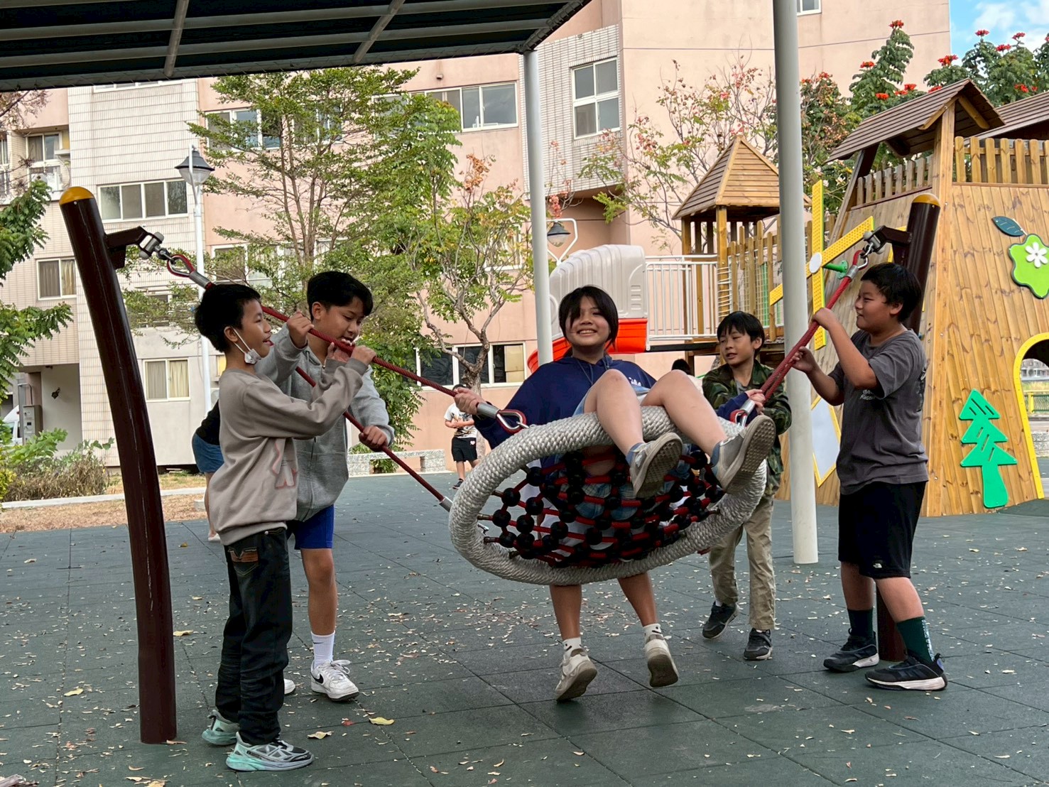 盪鞦韆時互相推一把、團體遊戲時彼此合作,孩子在笑聲中釋放壓力,也重新找回單純的快樂。