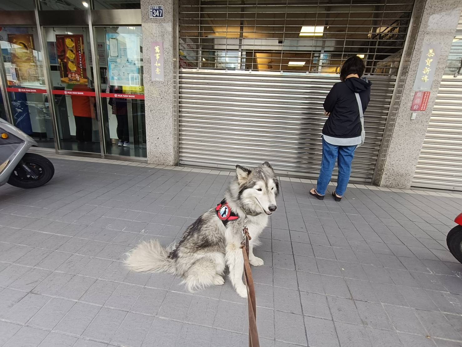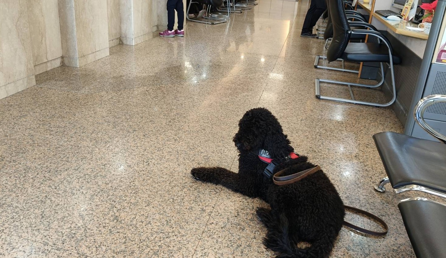 一月一號,新年第一天,我帶著狗狗來到人潮熙攘的銀行進行訓練。即使在忙碌的人群中,也必須要求狗狗不能隨意與他人互動。這樣的訓練目的很單純,卻也非常重要——這正是為了牠未來能成為一位可靠的工作夥伴。對使用者來說,一隻情緒穩定、專注沉著的工作犬,意義非凡。