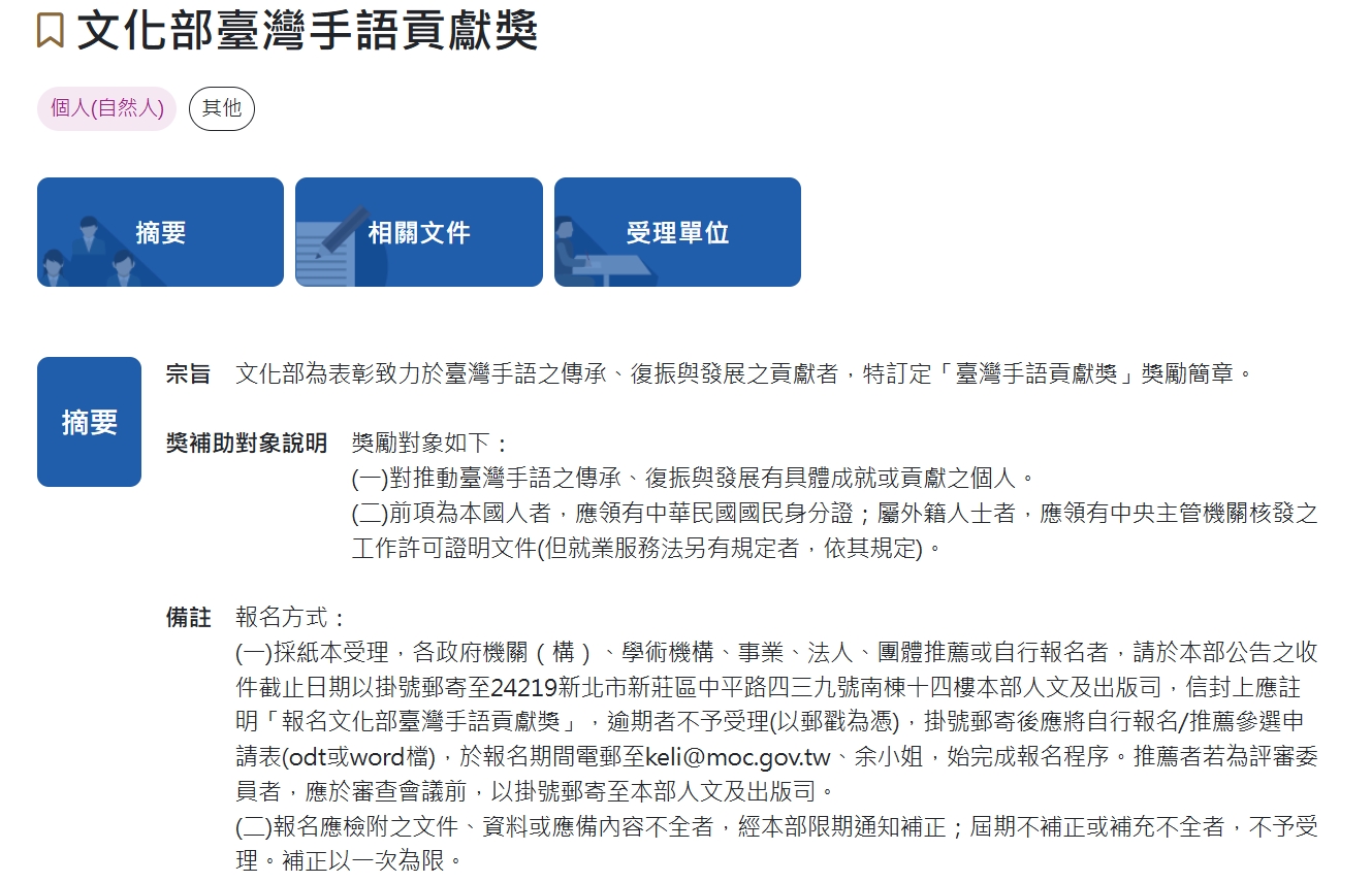 圖片五:「臺灣手語貢獻獎」獎勵簡章